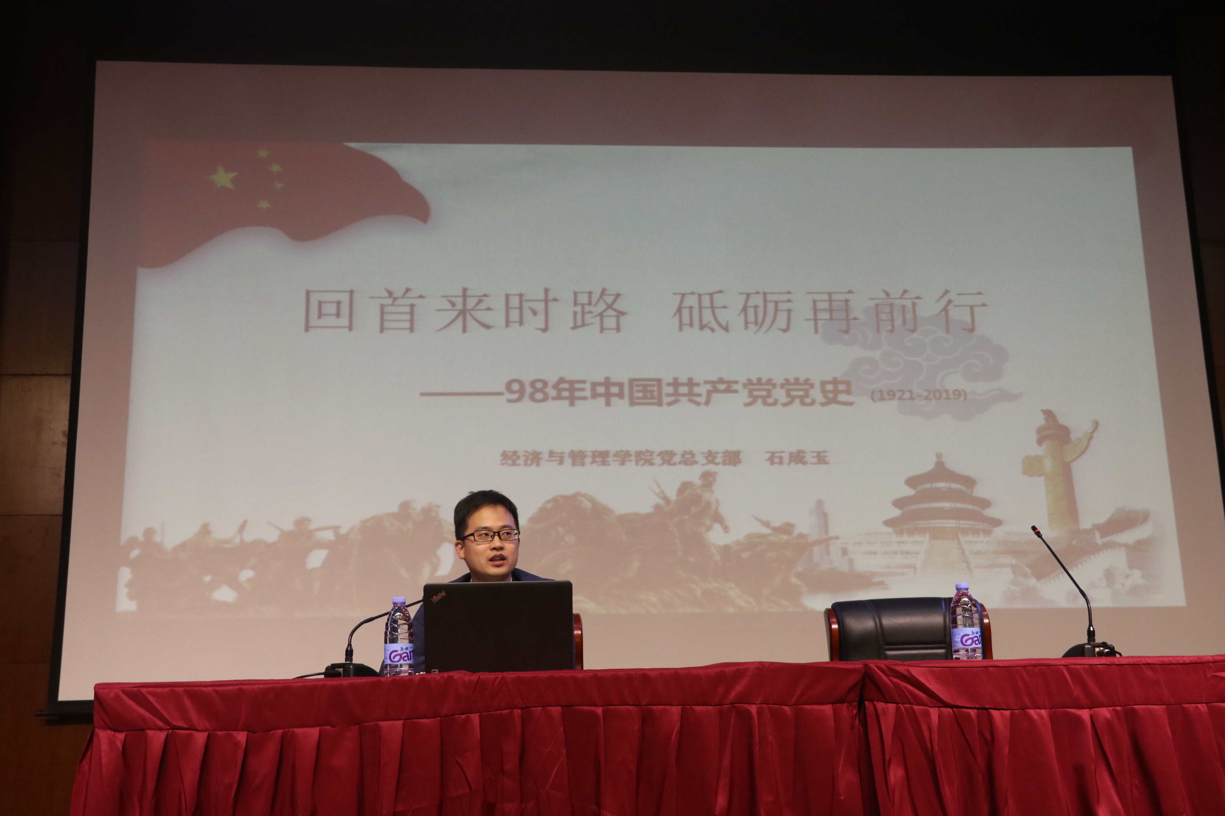为切实做好我院大学生学党史、知党情工作,积极引导大学生自觉争做中国特色社会主义的坚定信仰者和忠实实践者,帮助学生了解中国共产党的历史,引导入党积极分子端正入党动机。经济与管理学院党总支部于10月21日下午16:00组织300余人在图文楼报告厅开展“回首来时路 砥砺再前行”入党启蒙教育主题讲座。讲座由经济与管理学院党总支书记石成玉老师主讲。