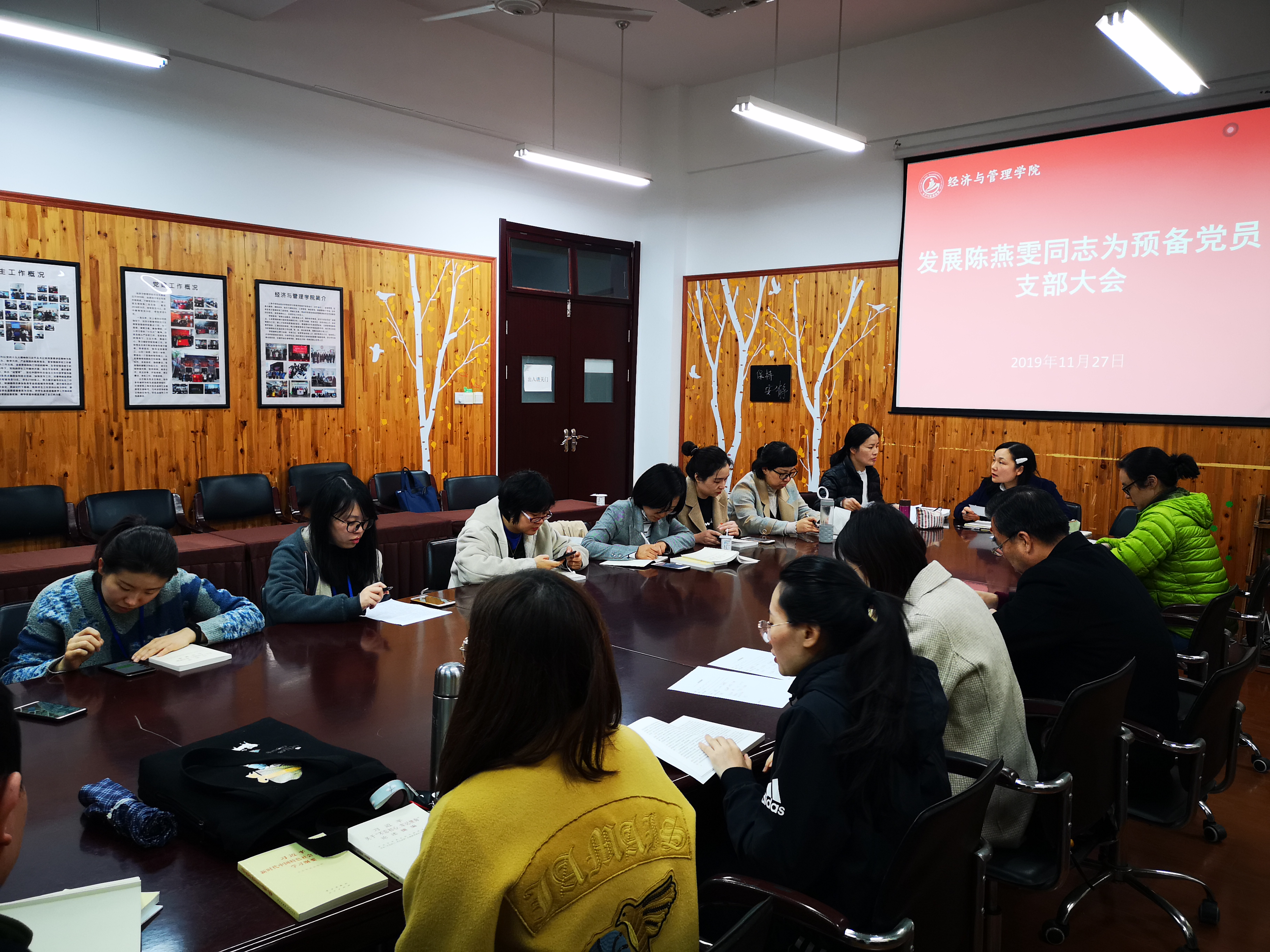 2019年11月27日,经济与管理学院第二党支部在三号楼313会议室召开接收陈燕雯同志为预备党员支部大会,会议由经管学院第二党支部书记杨慧同志主持。