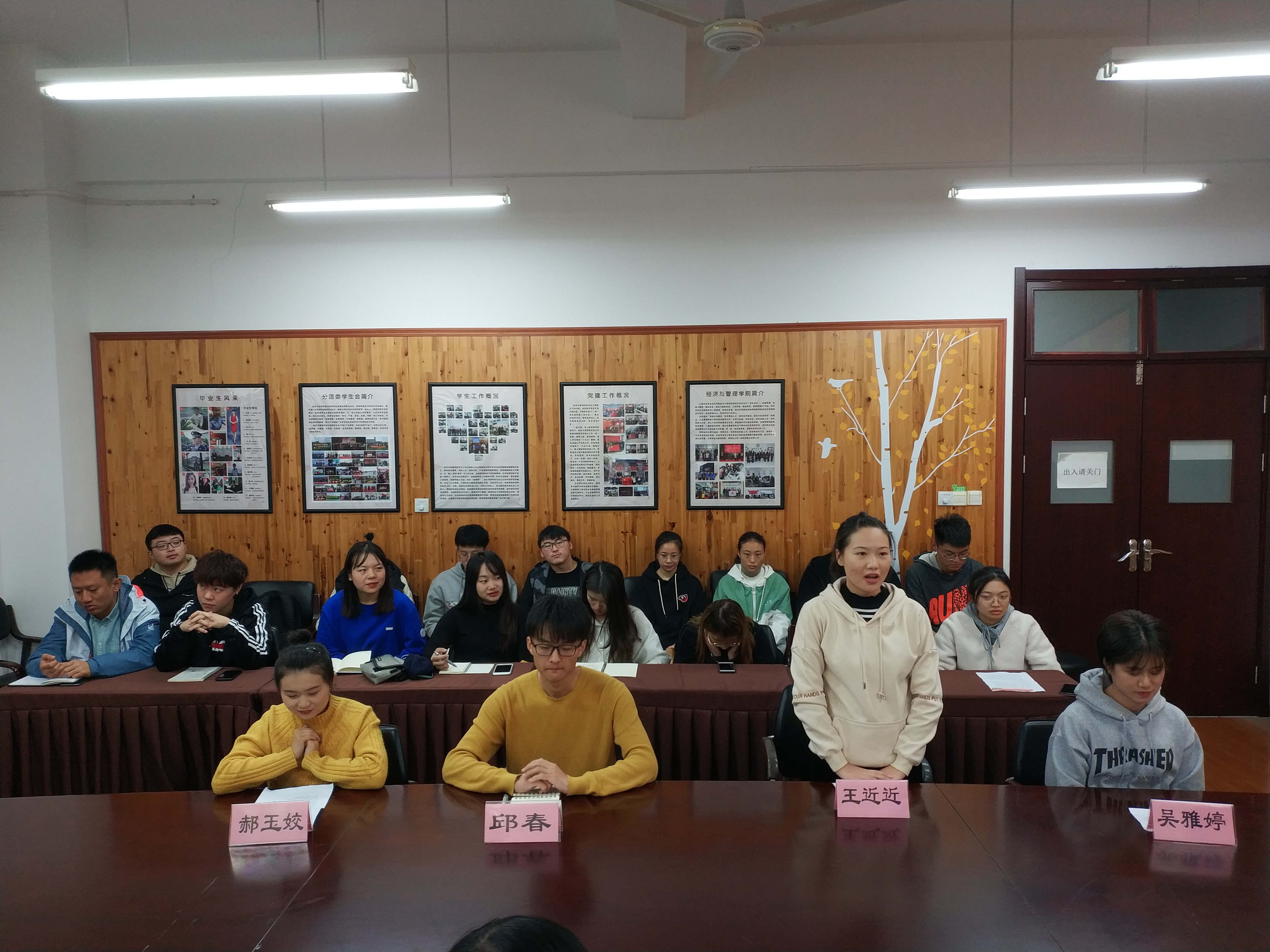首先由审批对象17工商2班吴雅婷、17工商2班郝玉姣、17金融2班邱春、17报关王近近进行自我介绍并从思想上、生活上、工作上和学习上分别进行阐述,之后由他们的第一入党介绍人邵静老师、岳建梅老师、韩雯倩老师分别对他们进行客观评价以及向他们提出了建设性的意见和建议。最后所有在场的党员老师进行匿名投票,经表决,全票通过上述4名同学成为预备党员。
