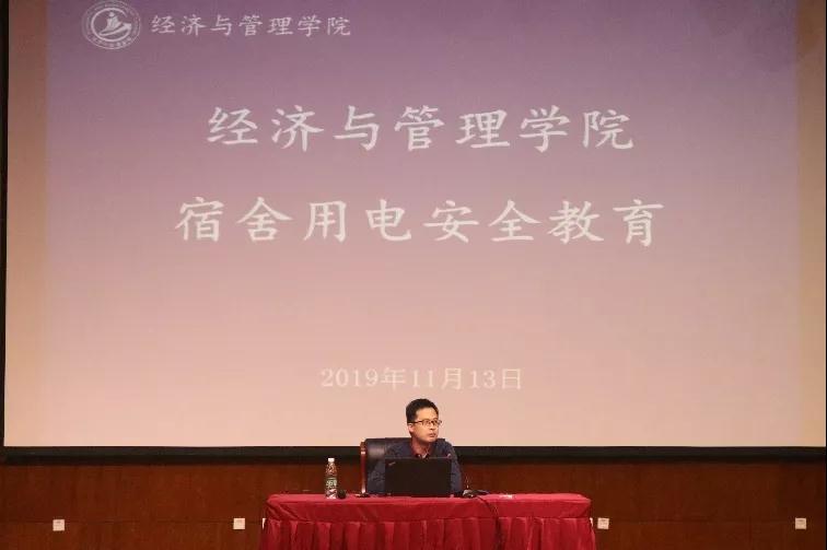寝室用电的安全直接关系到一个校园的平安与和谐,甚至关系到学生的生命、财产安全,虽说人有情,但火灾无情。我们该如何有效抵制与预防火灾的发生?那就需要我们全院师生提高警惕,加强消防安全防范意识,树立良好的生活习惯,齐心协力,共同预防并抵制火灾的发生。经济与管理学院于11月13日下午16:45在图文楼报告厅开展“宿舍用电安全教育”主题讲座,经管学院各宿舍宿舍长和全体辅导员老师参加会议。讲座由经济与管理学院党总支书记石成玉老师主讲。安全无小事,火灾是无情的,警钟要长鸣。结合近期学校下发的各类安全工作会议文件精神,石成玉老师为同学们做了深入而细致的讲解,会后,石老师要求全体参会的宿舍长,将此次会议内容传达到各个宿舍。