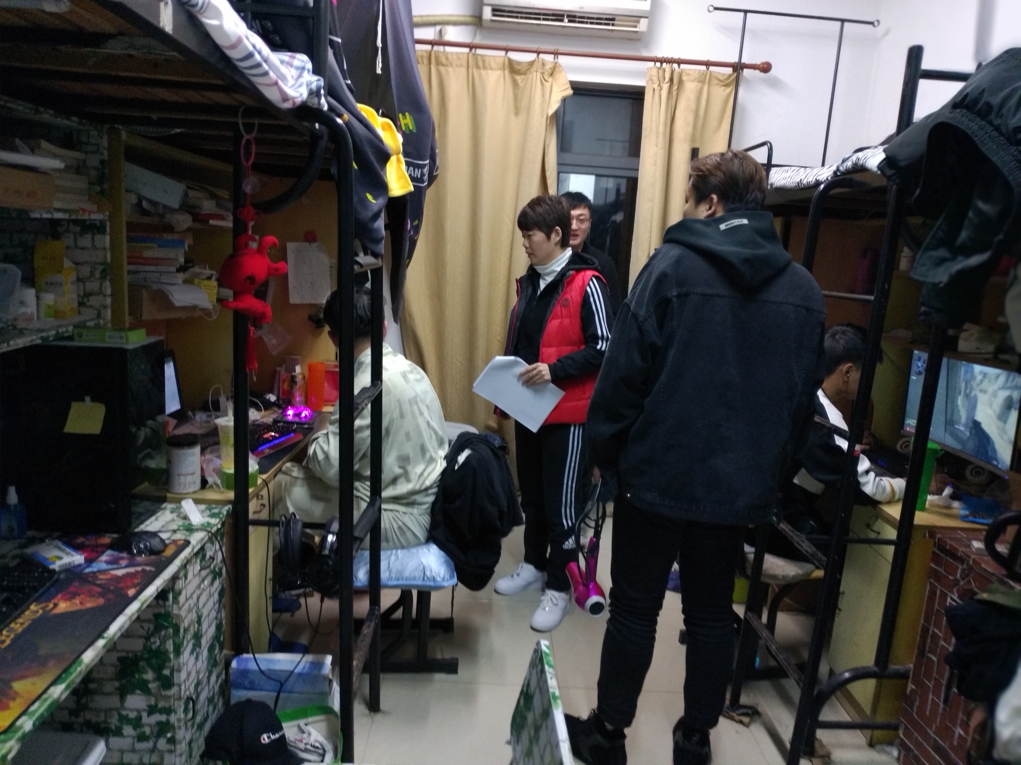 为了进一步加强学生宿舍安全管理工作,消除宿舍安全隐患, 12月12晚李玲老师带领各班班长深入14、15、16号楼寝室学生宿舍进行安全检查。此次检查主要针对就宿舍内务卫生、宿舍易燃物、违规使用电器和管制刀具、宿舍安全等情况进行全面的检查。