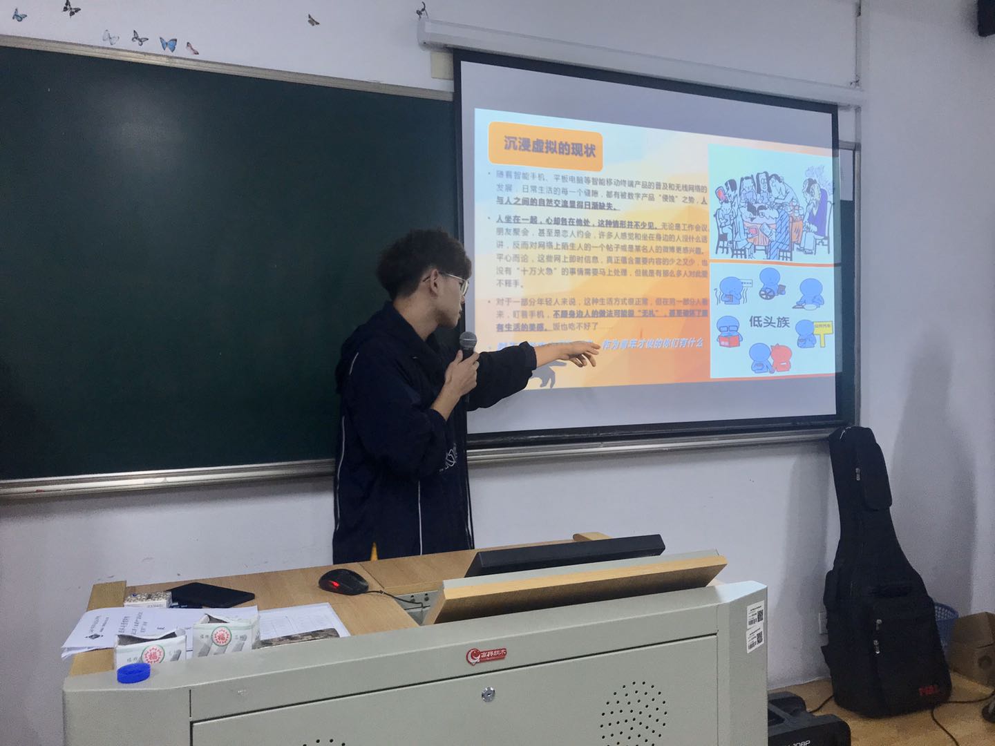本次活动就低头族产生的原因、沉浸虚拟的现状、手机对身体的危害、放下手机的四个理由及游戏活动开展。会上着重的分析了低头族产生的原因以及现状,从社会环境角度分析,快节奏生活、大城市通勤路线拉长等,客观上令私人时间碎片化,属于自己的“整块”时间越来越少,但一个人吃饭、赶路的机会却增多,导致不少年轻人只能抓紧碎片时间,通过数字终端进行娱乐休闲。以智能手机为代表的数字终端提供了丰富的应用程序,带来生活的便利和多样的娱乐手段,所以在这样的社会大环境下诞生了越来越多的“低头族”。接下来进行了游戏活动环节,先由赵俊杰与华世超同学带来了歌曲表演引起同学们阵阵掌声,接着由组织委员带领大家进行了“逛三园”和“踩气球”的活动,同学们反响热烈积极参加,最终在欢声笑语中结束了本次团日活动。希望通过本次团日活动,让大家放下手机,学会主动去珍惜身边的点点滴滴,发现生活中的美好。