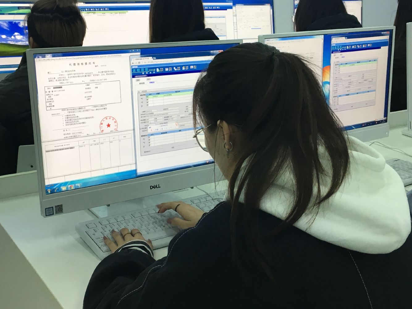 本次考试除了传统的笔试外,还加入了机考等偏重动手操作能力的考试形式。图为专业学生正在进行进出口商品报检实务的上机考试。
