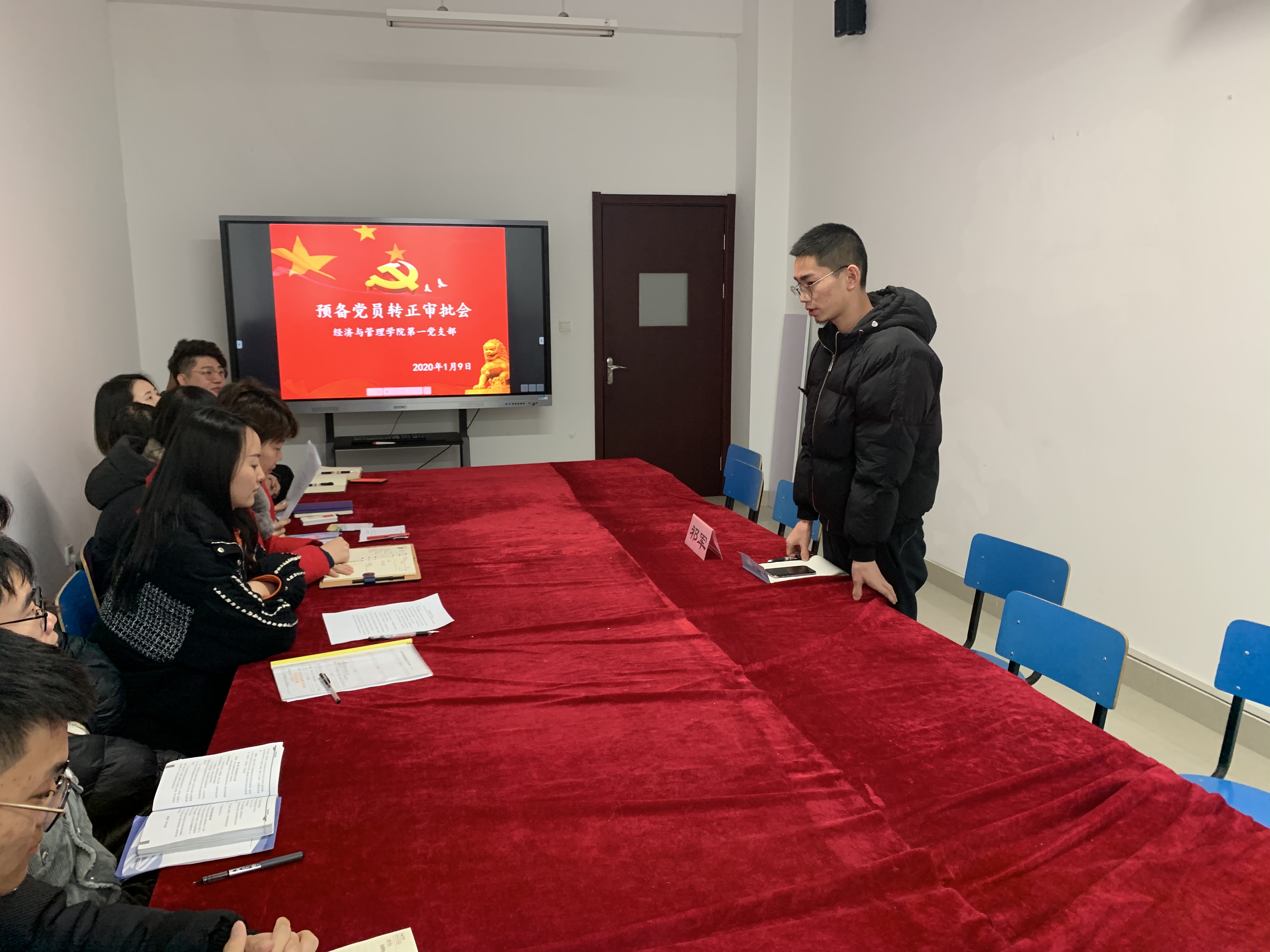 2020年1月9日下午,经济与管理学院第一党支部在4#203召开了预备党员转正大会,讨论祁军同志的转正事宜。会议由邵静老师主持,我支部共有党员24名,其中有表决权的正式党员11人,出席会议有表决权的党员11人,超过本支部有表决权党员半数,符合规定人数,可以开会。