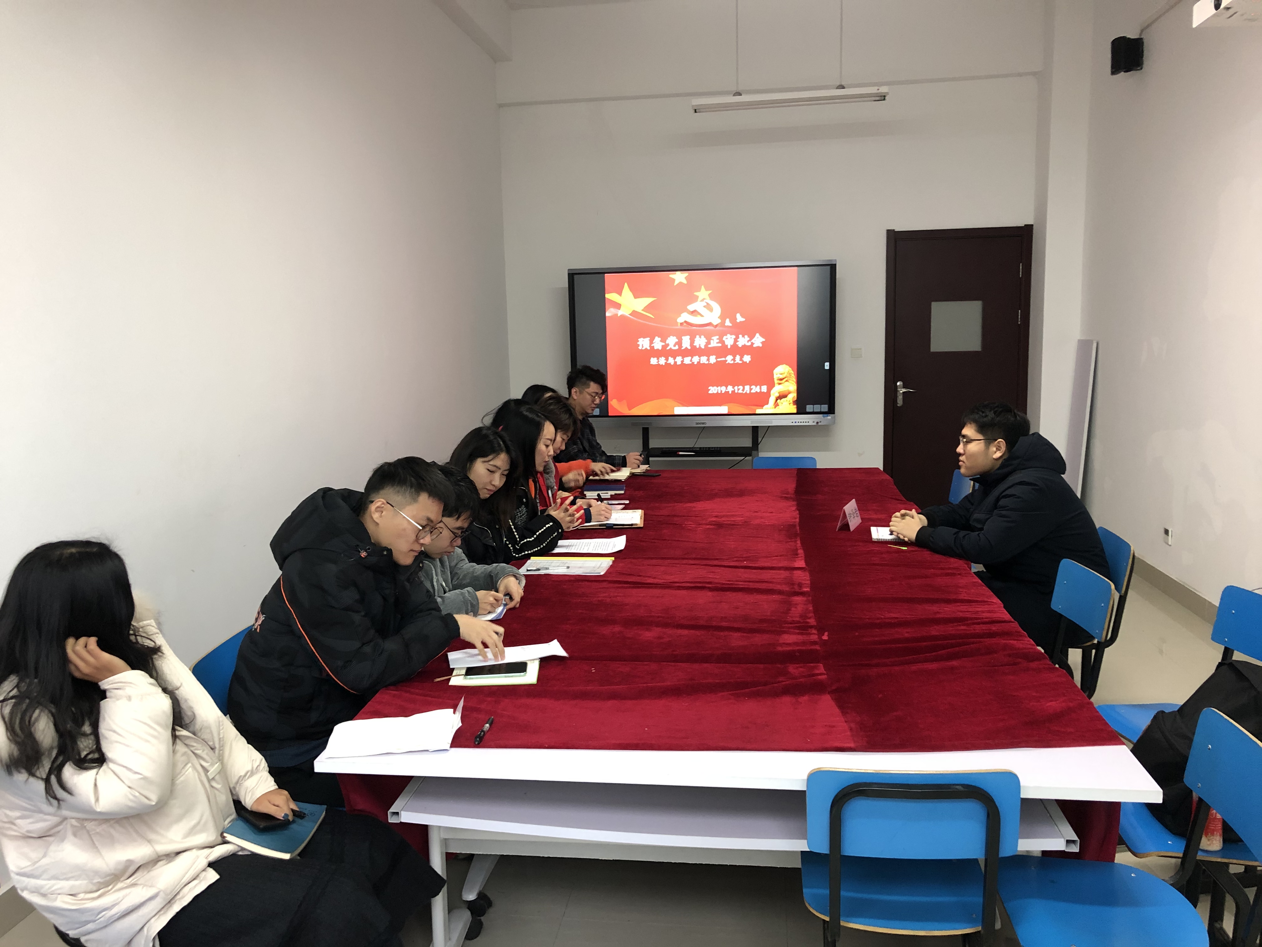 2019年12月24日下午,经济与管理学院第一党支部在4#203召开了预备党员转正大会,讨论钟泽岩同志的转正事宜。会议由邵静老师主持,我支部共有党员24名,其中有表决权的正式党员11人,出席会议有表决权的党员11人,超过本支部有表决权党员半数,符合规定人数,可以开会。