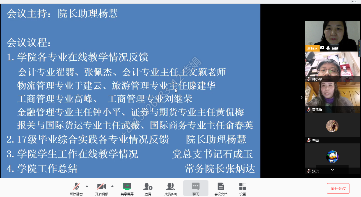2020年3月14日晚上8点,经管学院召开全体教师专业教学研讨会议,学院全体61名教职工参加在线会议,会议由院长助理杨慧老师主持。