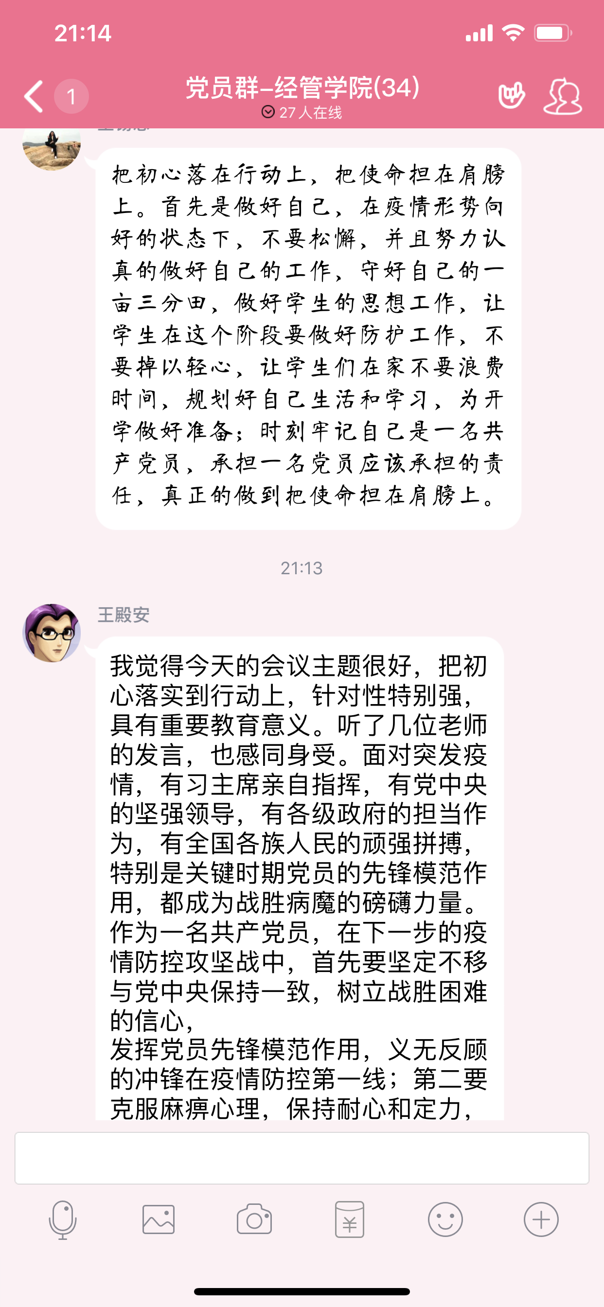 此次特殊时期的线上主题党日活动,让支部党员进一步提高认识统一思想,明确把初心落在行动上,把使命担在肩膀上的信念和责任,支部将把做好疫情防控工作作为巩固拓展“不忘初心、牢记使命”主题教育成果的重要战场,凝心聚力、坚定信心,迎难而上,为全力打好疫情防控阻击战做出应有的贡献。