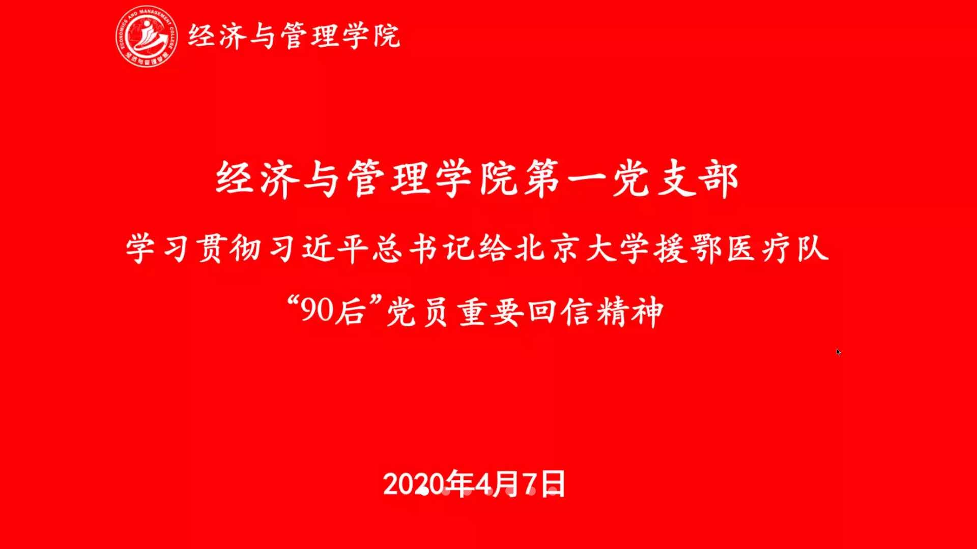 2020年4月7日14:00,经济与管理学院第一党支部在腾讯会议平台召开线上组织生活会,共同学习习近平总书记给北京大学援鄂医疗队“90”后党员重要回信精神,全体党员师生共同参与会议,会议由学院党支部副书记郭骏老师主持。
