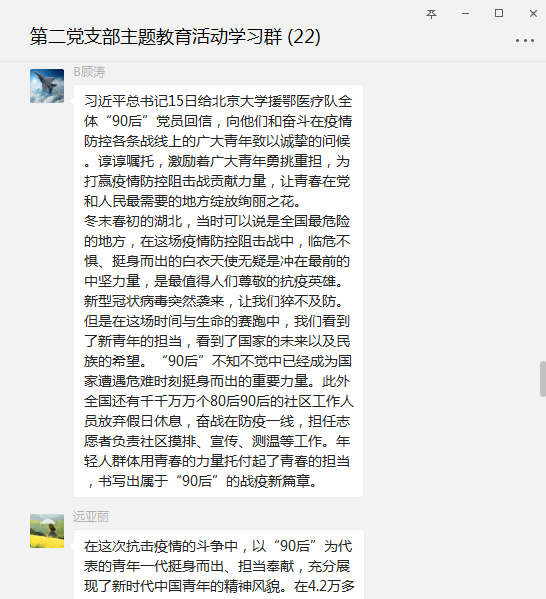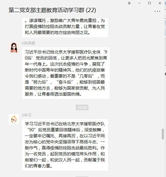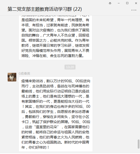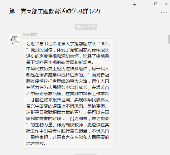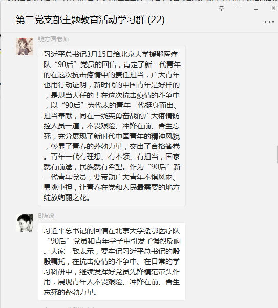 4月7日,经管学院第二党支部号召党员教师要以认真学习回信为契机,以骨干带全员,最大限度地发挥基层支部的战斗堡垒作用,为打赢此次疫情防控阻击战贡献青春力量。第二党支部掀起了云学习回信精神的热潮,每位党员教师通过认真学习后纷纷发表感言。