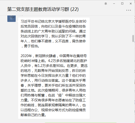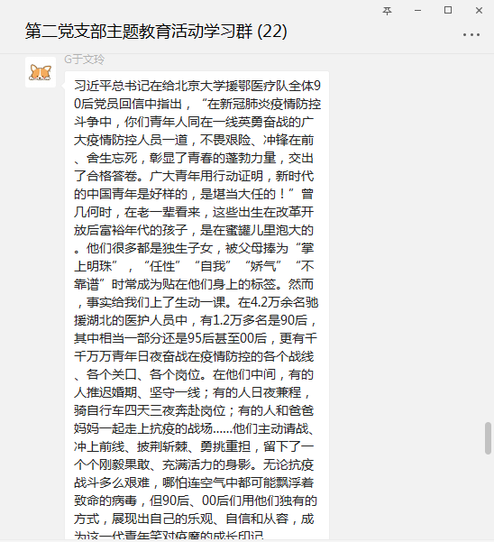 于文玲老师说习近平总书记在给北京大学援鄂医疗队全体90后党员回信中指出,“在新冠肺炎疫情防控斗争中,你们青年人同在一线英勇奋战的广大疫情防控人员一道,不畏艰险、冲锋在前、舍生忘死,彰显了青春的蓬勃力量,交出了合格答卷。广大青年用行动证明,新时代的中国青年是好样的,是堪当大任的!”曾几何时,在老一辈看来,这些出生在改革开放后富裕年代的孩子,是在蜜罐儿里泡大的。他们很多都是独生子女,被父母捧为“掌上明珠”,“任性”“自我”“娇气”“不靠谱”时常成为贴在他们身上的标签。然而,事实给我们上了生动一课。在4.2万余名驰援湖北的医护人员中,有1.2万多名是90后,其中相当一部分还是95后甚至00后,更有千千万万青年日夜奋战在疫情防控的各个战线、各个关口、各个岗位。在他们中间,有的人推迟婚期、坚守一线;有的人日夜兼程,骑自行车四天三夜奔赴岗位;有的人和爸爸妈妈一起走上抗疫的战场……他们主动请战、冲上前线、披荆斩棘、勇挑重担,留下了一个个刚毅果敢、充满活力的身影。无论抗疫战斗多么艰难,哪怕连空气中都可能飘浮着致命的病毒,但90后、00后们用他们独有的方式,展现出自己的乐观、自信和从容,成为这一代青年笑对疫魔的成长印记。