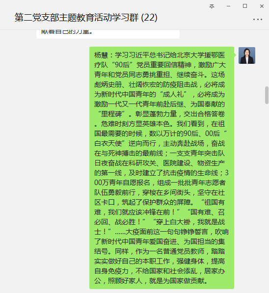 杨慧老师说学习习近平总书记给北京大学援鄂医疗队“90后”党员重要回信精神,激励广大青年和党员同志勇挑重担、继续奋斗。这场彪炳史册、壮阔恢宏的防疫阻击战,必将成为新时代中国青年的“成人礼”,必将成为激励一代又一代青年前赴后继、为国奉献的“里程碑”。彰显蓬勃力量,交出合格答卷。危难时刻方显英雄本色,我们看到,在祖国最需要的时候,数以万计的90后、00后“白衣天使”逆向而行,主动奔赴战场,奋战在与死神搏击的最前线;一支支青年突击队日夜奋战在科研攻关、医院建设、物资生产的第一线,及时建立了抗击疫情的生命线;300万青年自愿报名,组成一批批青年志愿者队伍勇毅前行,穿梭在乡间街头,坚守在社区卡口,筑起了保护群众的屏障。“祖国有难,我们就应该冲锋在前!”“国有难、召必回、战必胜!”“穿上白大褂,我就是战士!”……大疫面前这一句句铮铮誓言,吹响了新时代中国青年爱国奋进、为国担当的集结号。同样,作为一名普通党员教师,踏踏实实做好自己的本职工作,强健身体,提高自身免疫力,不给国家和社会添乱,居家办公,照顾好家人,就是为国家做贡献。