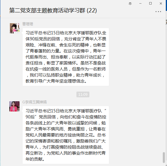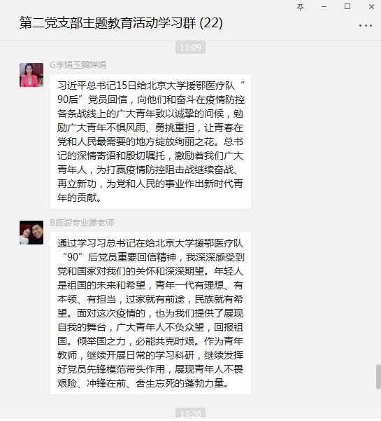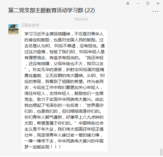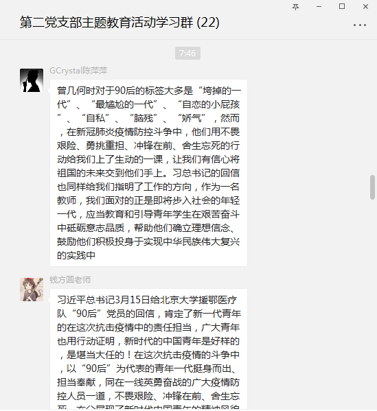 4月7日,经管学院第二党支部号召党员教师要以认真学习回信为契机,以骨干带全员,最大限度地发挥基层支部的战斗堡垒作用,为打赢此次疫情防控阻击战贡献青春力量。第二党支部掀起了云学习回信精神的热潮,每位党员教师通过认真学习后纷纷发表感言。