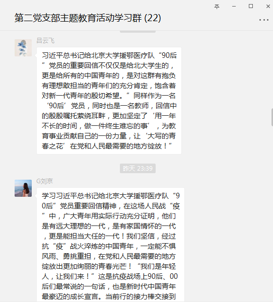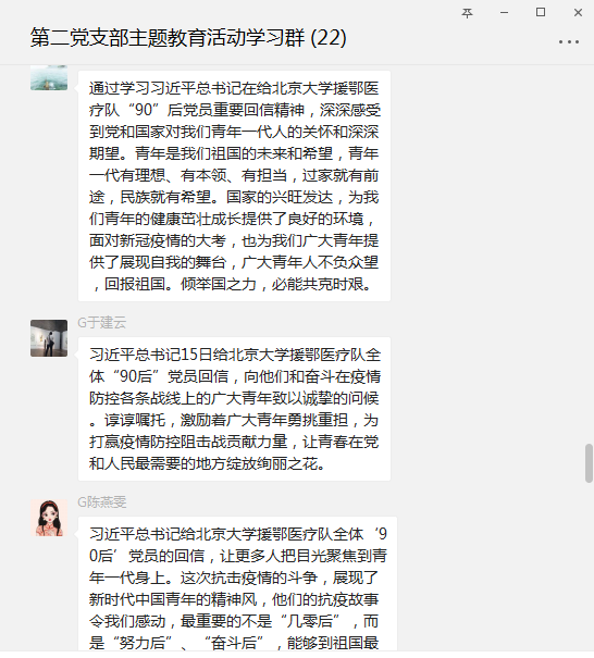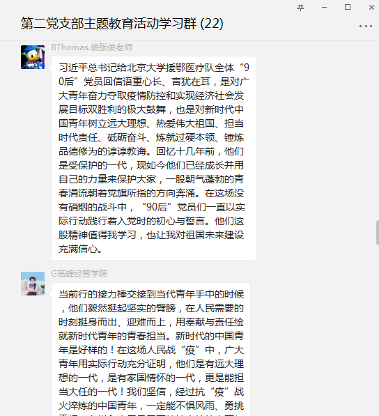 经管学院第二党支部的党员教师们纷纷表示,通过学习习近平总书记在给北京大学援鄂医疗队“90后”党员重要回信精神,深深感受到党和国家对我们青年一代人的关怀和深深期望。青年是我们祖国的未来和希望,青年一代有理想、有本领、有担当,国家就有前途,民族就有希望。国家的兴旺发达,为我们青年的健康茁壮成长提供了良好的环境,面对新冠疫情的大考,也为我们广大青年提供了展现自我的舞台,广大青年人不负众望,回报祖国。倾举国之力,必能共克时艰,中国加油,中国必胜!