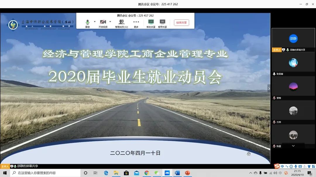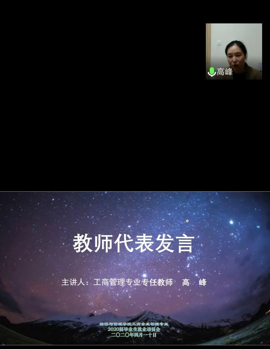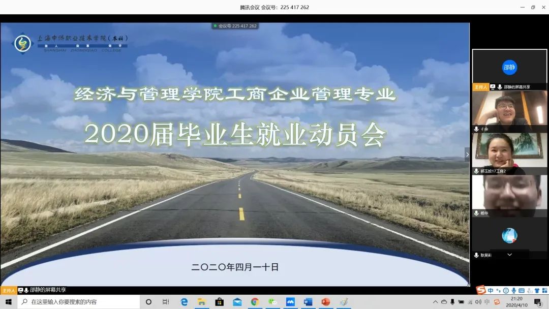 根据学校就业办关于20届毕业生会议精神,按照经管学院总体部署要求,4月10日20:00—21:30,工商管理专业讲座腾讯会议,召开了2020届毕业生就业动员会。专业主任、全体专业教师、辅导员和全体20届工商企业管理专业毕业生参加会议,会议由辅导员邵静老师主持。