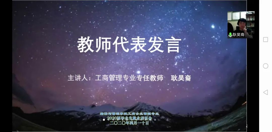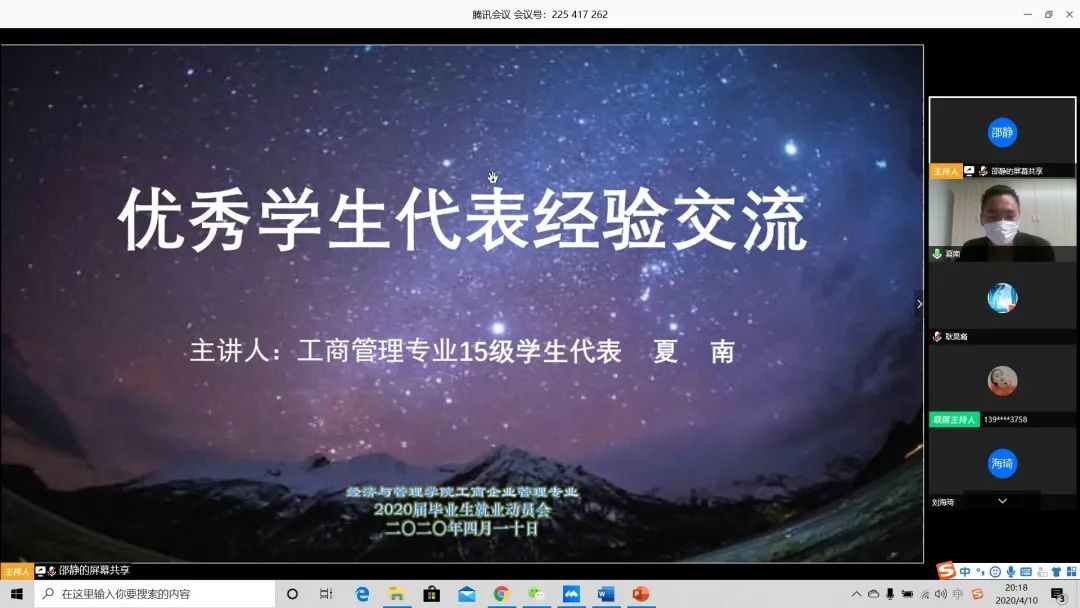 根据学校就业办关于20届毕业生会议精神,按照经管学院总体部署要求,4月10日20:00—21:30,工商管理专业讲座腾讯会议,召开了2020届毕业生就业动员会。专业主任、全体专业教师、辅导员和全体20届工商企业管理专业毕业生参加会议,会议由辅导员邵静老师主持。