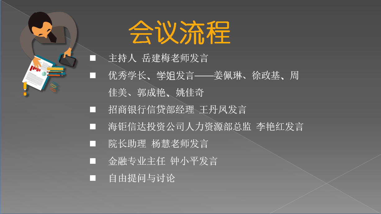 招商银行信贷部经理王丹凤女士和海钜信达投资公司人力资源部总监李艳红女士运用工作中丰富的经历给同学们在不论是工作还是学习方面给予了宝贵建议,告诉同学们学习是无止尽的,无论是在工作还是校园中都应该努力学习知识、技术。提高自身能力才能有更好的发展。