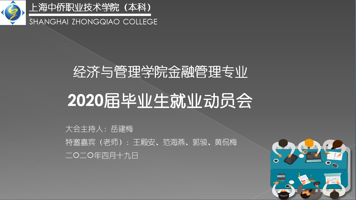 2020年4月19日星期日晚上7:00,经济与管理学院2020届金融管理就业动员会在线上召开。会议由辅导员岳建梅老师主持,参加本次会议的有经管学院副院长王殿安教授、副院长范海燕教授、院长助理杨慧老师、金融专业主任钟小平老师、全体金融管理专业老师及本专业全体学生。