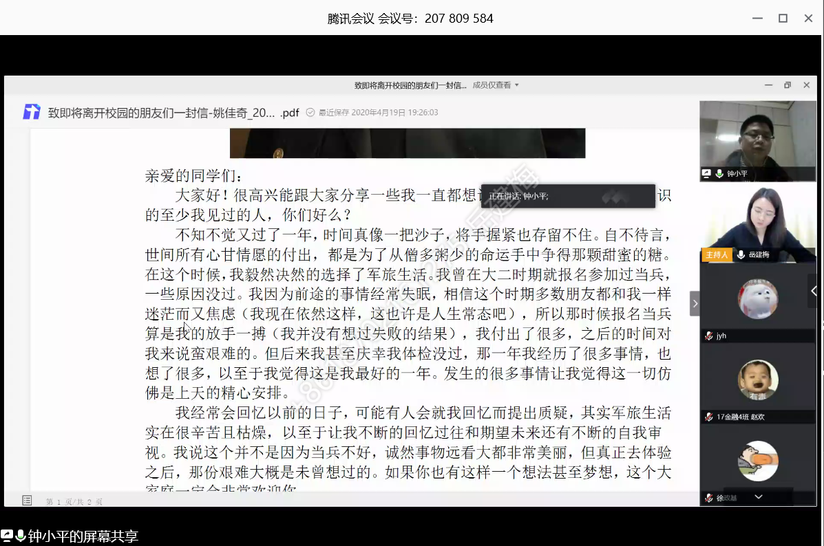 会议开始,由学长学姐分享升学、就业、入伍等相关经验。其中周佳美学姐告诉了学弟学妹们要平衡工作与学历的重要性,以自身经历给同学们做了良好的榜样。徐政基学长给大家介绍了自己准备专升本的经验,叮嘱同学们在考前最后一个月一定要背诵好知识点,加强记忆。身为入伍士兵的姚佳奇学长因临时有训练不能参加会议,但以信件的形式给同学们加油。
