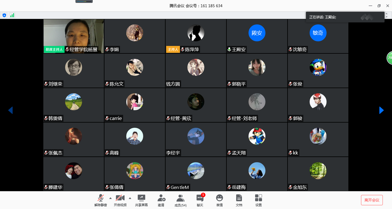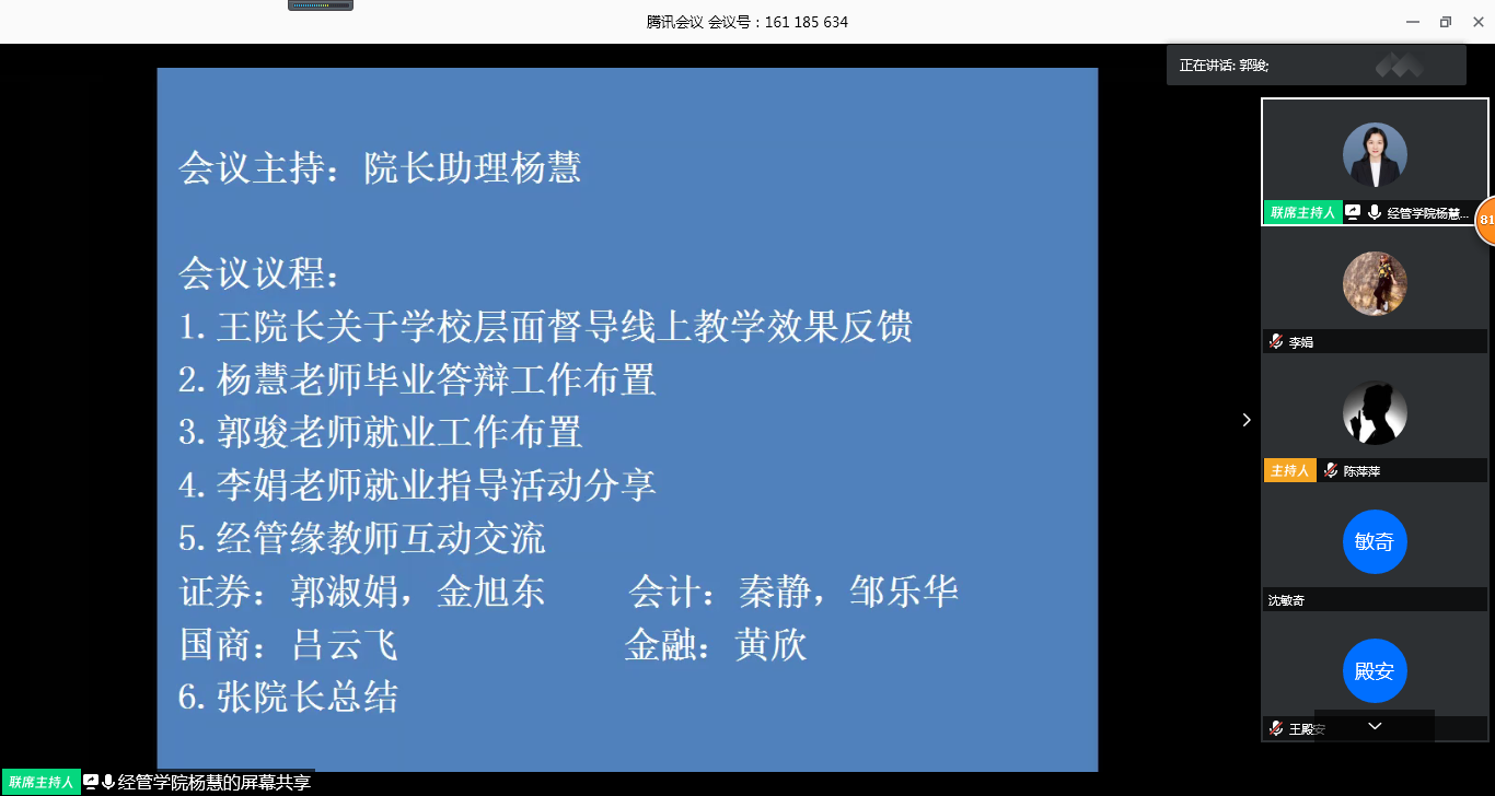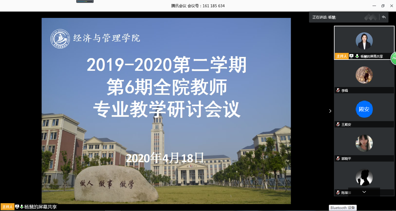 2020年4月18日晚上8点,经管学院利用线上视频召开2019-2020第二学期第六期教学研讨会,学院61名教职员工参加在线会议,会议由院长助理杨慧老师主持。