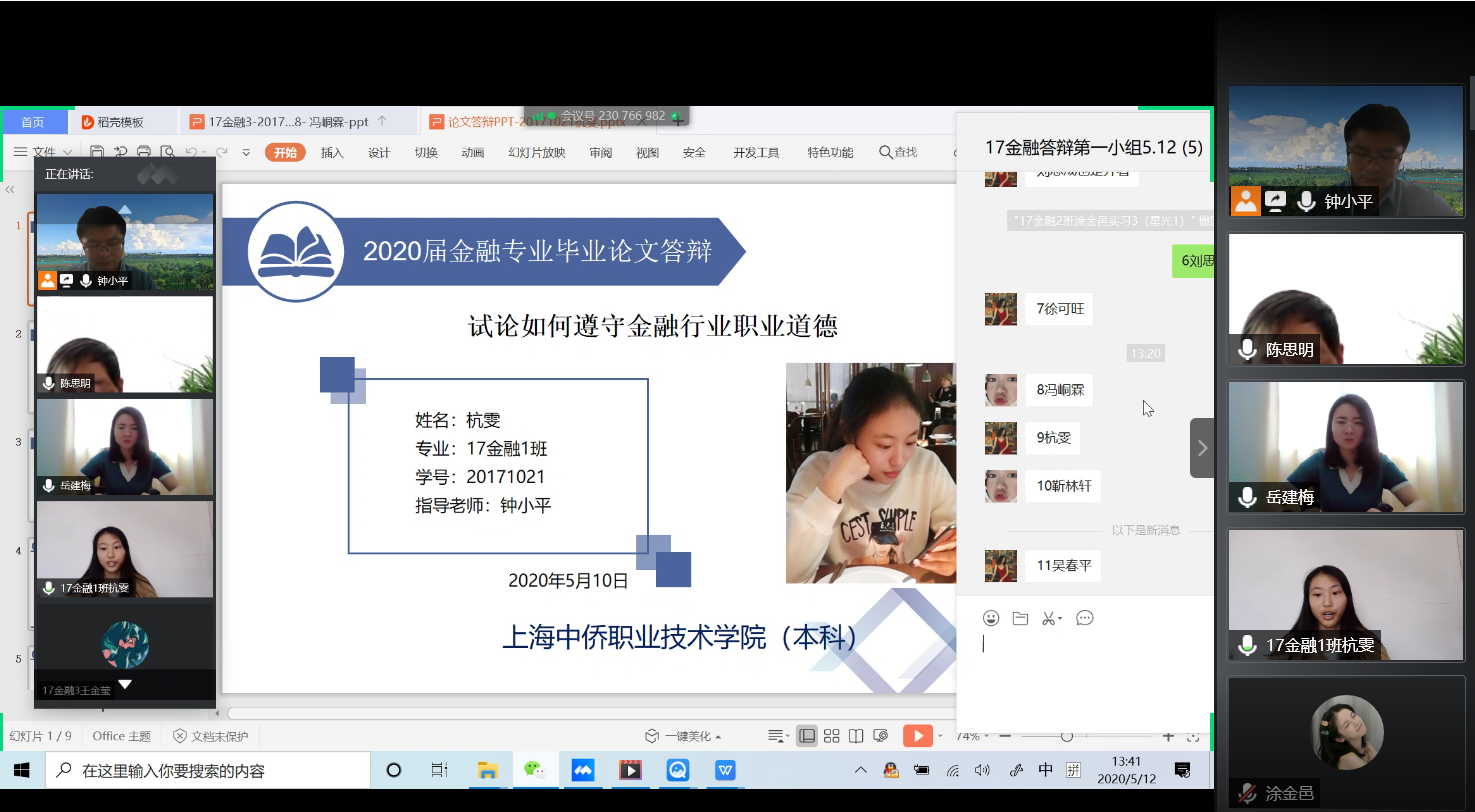 我还特地选了一块白墙当做背景,检查好自己的网络,调整手机支架,一切准备就绪,在答辩当天12:30的时候进入会议,老师们和同学们已经准备就绪,在等待的过程中我也没有那么紧张了,我只需要把我做好的准备呈现出来就可以了。答辩也顺利结束了,但是美中不足的是我说地太快了,到后半段才调整过来。这次的答辩是毕业之前的最后一次考核了,结束了我的大学生活,我的人生也将开启一个新起点。 (17金融1班杭雯)