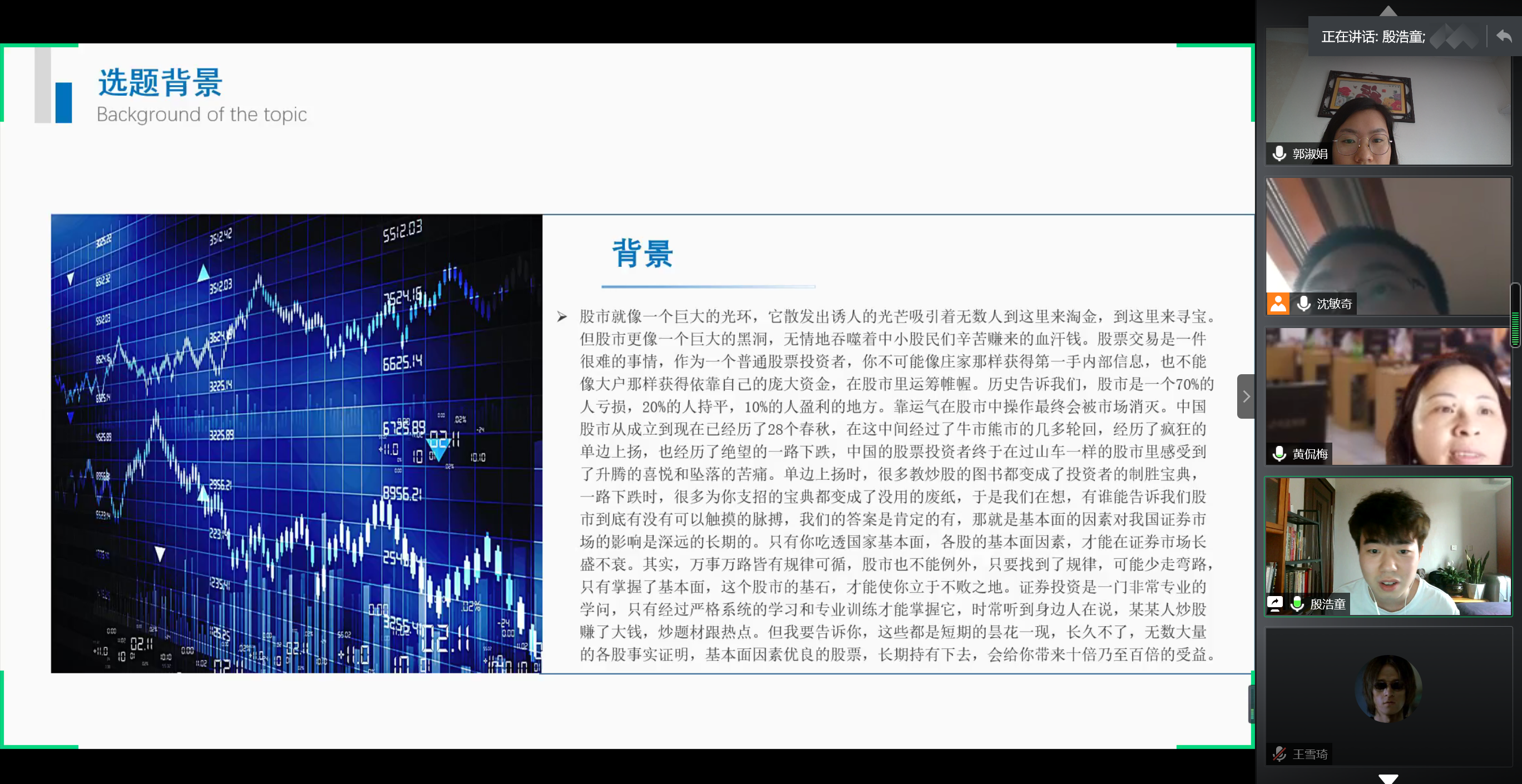 答辩开始时,主持人宣读答辩程序和要求,17证券同学共分为7组,5人为一组,每次一组同学进入会议室。答辩过程中,学生使用“屏幕共享”对自己的毕业设计(论文)成果进行展示和汇报;老师们在仔细观看和听取之后,根据成果材料和汇报情况,与学生交流问答,并提出意见和建议。