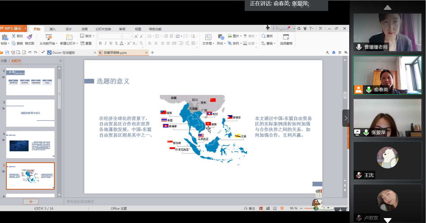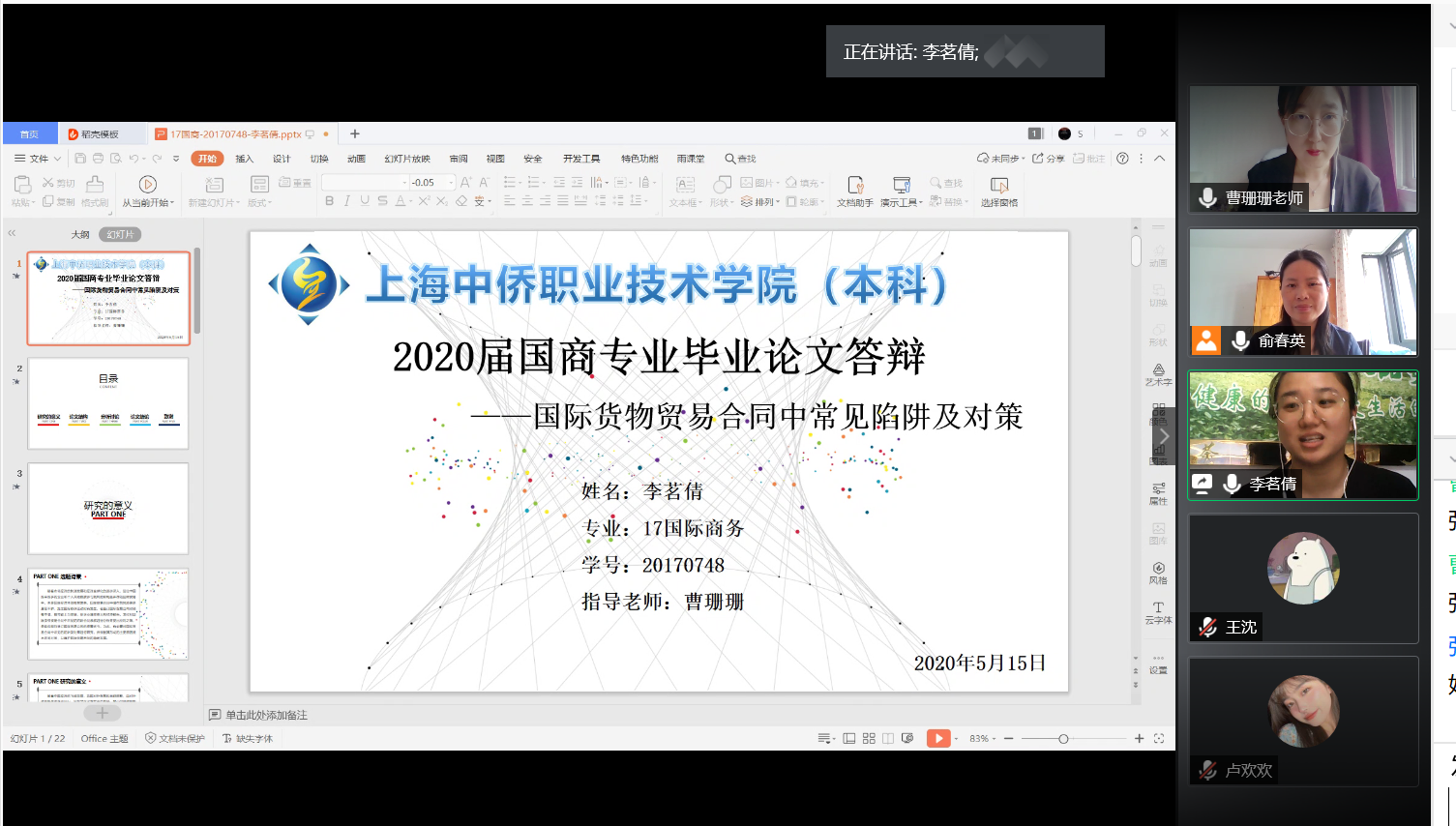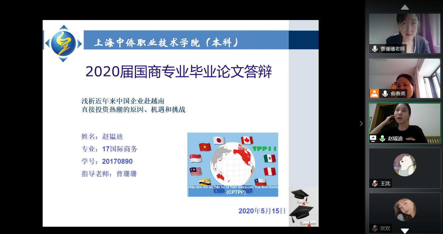 2020年5月15日12:30,国际商务专业2020届线上毕业论文答辩工作顺利开展。本次答辩对象为2017级国际商务专业学生,参加此次毕业论文答辩工作的有专业主任俞春英、专业教师刘玉柱、曹珊珊、吕云飞、王沈、王锡念等老师。