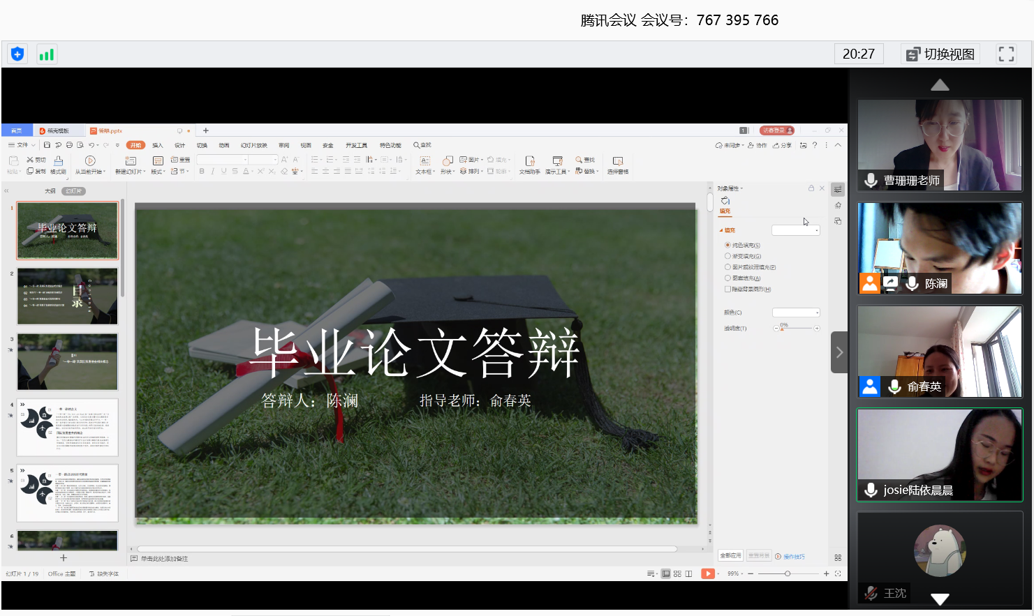 本次线上答辩利用腾讯会议进行,主要分为两个环节,第一个环节是学生汇报论文成果,第二个环节是学生即兴答辩。在答辩过程中,学生根据抽签顺序轮流共享屏幕进行答辩,整个线上论文答辩秩序井然。先由学生阐述选题目的、意义,论文主要观点及收获等内容;答辩老师认真听取学生的陈述后,有针对性地提出了问题和建议,学生在线回答老师提问。通过现场答辩,可以看出大部分学生都非常重视此次线上毕业论文答辩,事先做了充分准备工作;对论文的熟悉程度和专业知识的掌握程度也都比较理想,回答简明准确,虽然也存在着不足之处,但都得到了各答辩组3位答辩老师的肯定。另外,答辩老师也关切的询问了解了疫情期间各位学生的就业工作问题,并为学生加油打气。