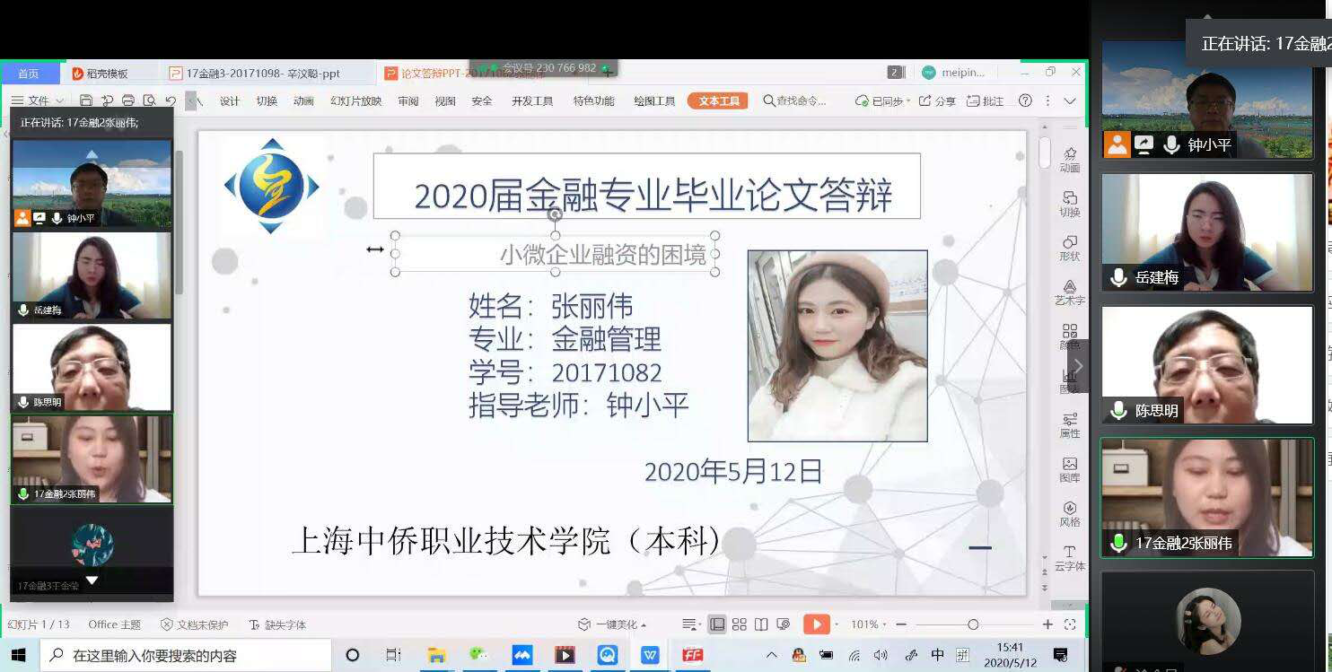 2020年是值得纪念具有特殊意义的一年,而今年也是一次特殊的毕业季,我们学校暂未通知返校,所以我们毕业生的论文答辩就在线上进行啦。中午12点30分,在刚开始答辩时,我怀着无比忐忑的心情进入了腾讯会议室,看着各位老师和同学们都准备好了,我的心情更加慌乱,心里就感觉有小鹿在乱撞。钟老师给我们简要介绍了一下会议大概持续的时间,然后语重心长的安慰同学们不要紧张,看着老师和蔼的的表情和给我们打气时的样子,我瞬间不紧张了。我是26号答辩者,慢慢的时间进行的好快,转眼就轮到我了,我按照之前准备好的稿子脱稿给老师慢慢阐述了一遍,也许是因为我之前准备的比较充分,老师问的问题我全都脱口而出回答完了。