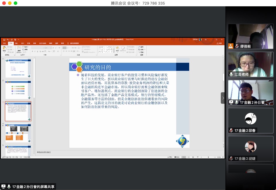 通过这次的毕业答辩,也让我对毕业答辩有了更深的认识,吸收了在毕业答辩的经验和教训,我也是提前进行答辩的学习和了解。结果还是不是很理想很满意,后面老师对于答辩的内容进行的提问,有点紧张,不知道该怎么去回答老师的问题,老师也是直面的指出答辩过程中的错误的地方,同时也给出了自己的建议。这次答辩让我更加注重理论和实际相结合,多多理解课本上的知识,让我对以后的道路有了更明确的目的,做事要更严谨,更稠密。(17金融2班 邱春)
