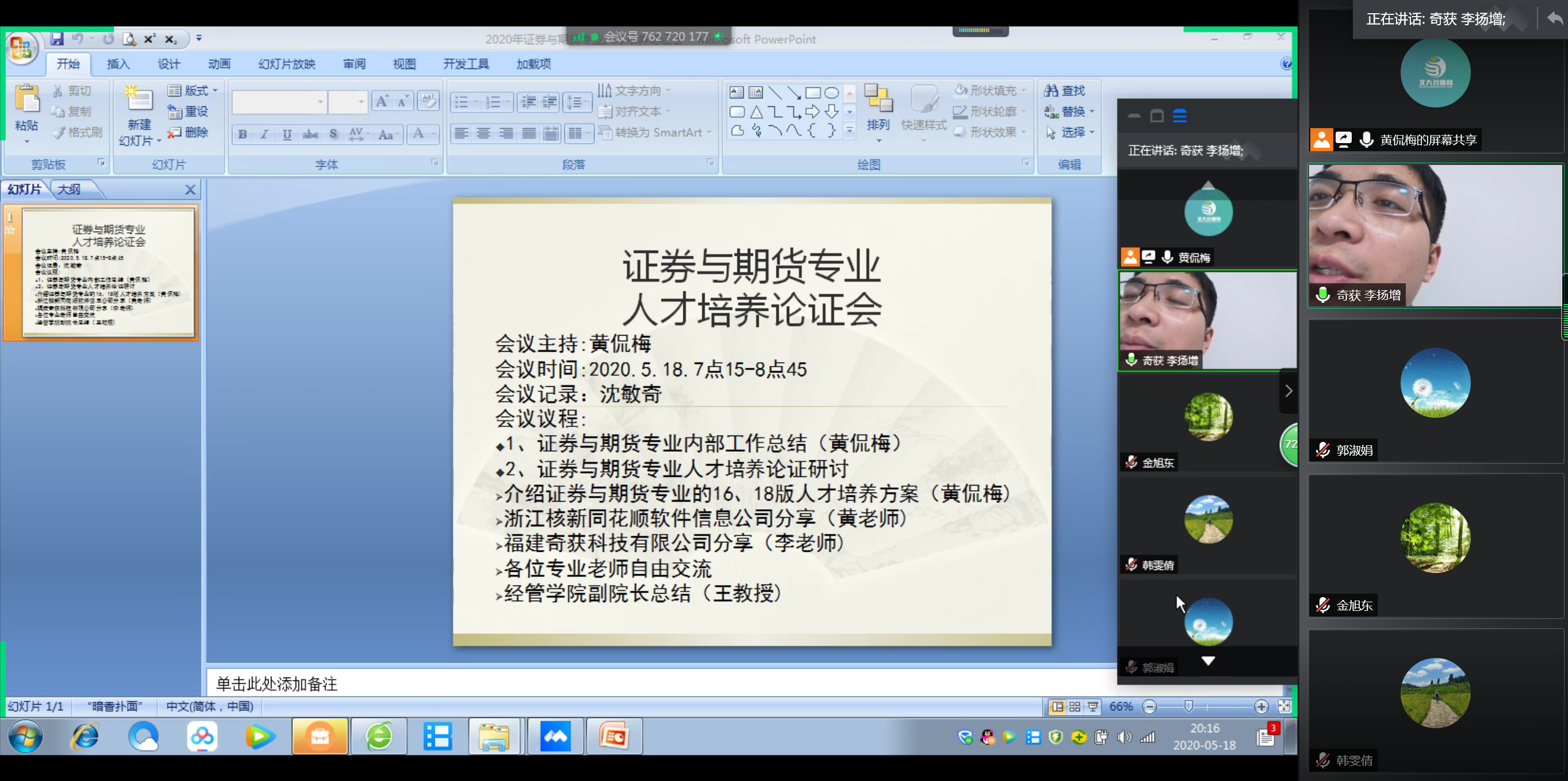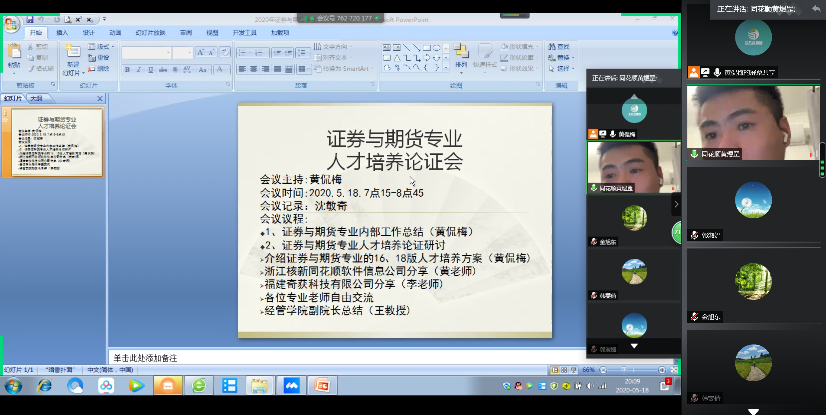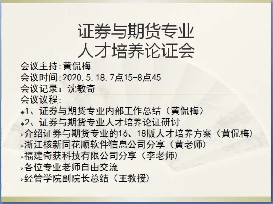 为进一步提高人才培养质量和适应社会发展需求,推动应用型人才培养工作,证券与期货专业根据学校关于修订2020版人才培养方案工作的部署,于5月18日晚上19:45-21:00在腾讯会议开展了专业人才培养方案(修订)研讨会。本次会议邀请了浙江核新同花顺软件信息公司黄经理、福建奇获科技有限公司李经理、经济与管理学院教学副院长王殿安教授以及证券与期货专业老师参加本次研讨论。