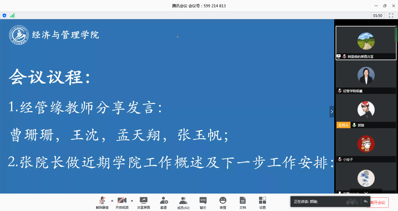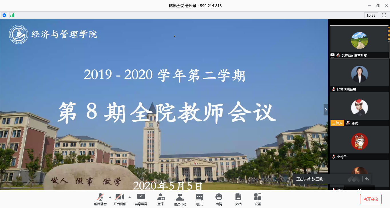 2020年5月5日晚上8点,经管学院利用线上视频召开2019-2020第二学期第八期教学研讨会,学院全体61名教职工参加在线会议,会议由学院党总支副书记郭骏老师主持。
