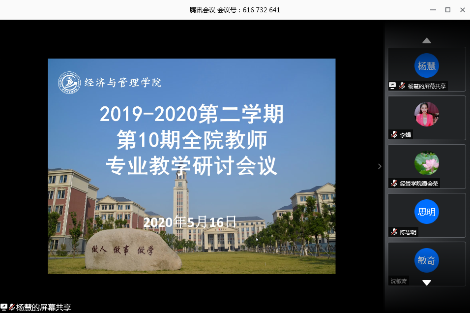 2020年5月16日晚上8点,经管学院利用线上视频召开2019-2020第二学期第十期教学研讨会,学院全体61名教职工参加在线会议,会议由院长助理杨慧老师主持。