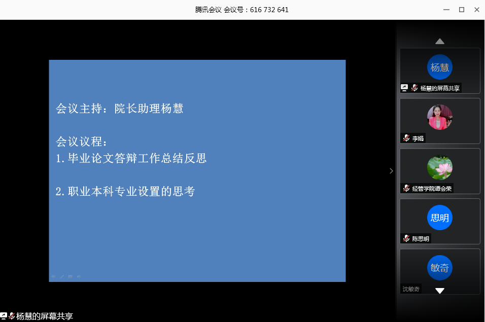 会议共有两个议程,毕业论文答辩工作总结反思,职业本科专业设置的思考。