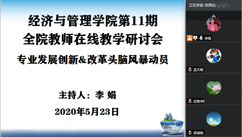 2020年5月23日晚上8点,经管学院利用线上视频召开2019-2020第二学期第十一期教学研讨会,学院全体61名教职工参加在线会议,会议由院长助理李娟老师主持。