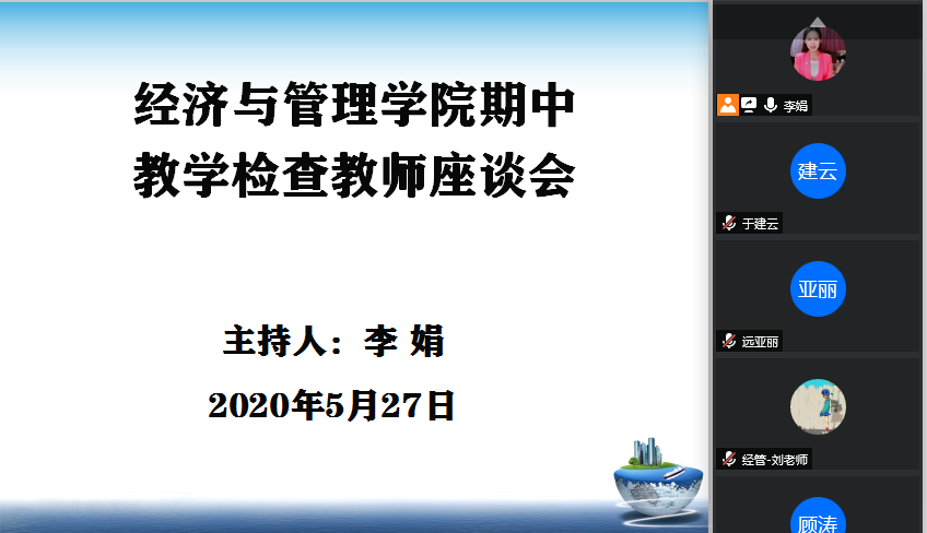 2020年5月27日晚上8点,经管学院利用线上视频召开2019-2020第二学期第十二期期中教学检查教师座谈会,学院全体61名教职工参加在线会议,会议由院长助理李娟老师主持。