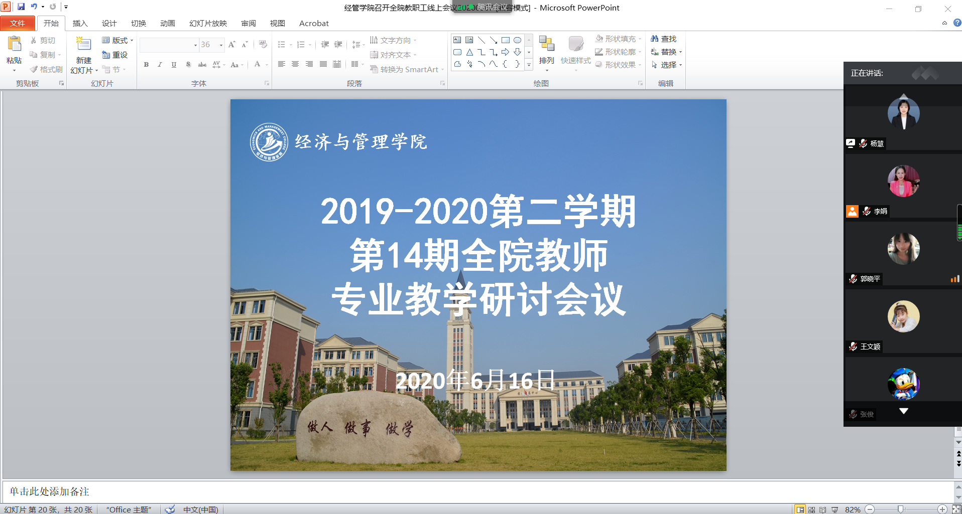 2020年6月16日晚上8点,经管学院利用线上视频召开2019-2020第二学期第十四期教学研讨会,学院全体62名教职工参加在线会议,会议由常务院长张教授主持。