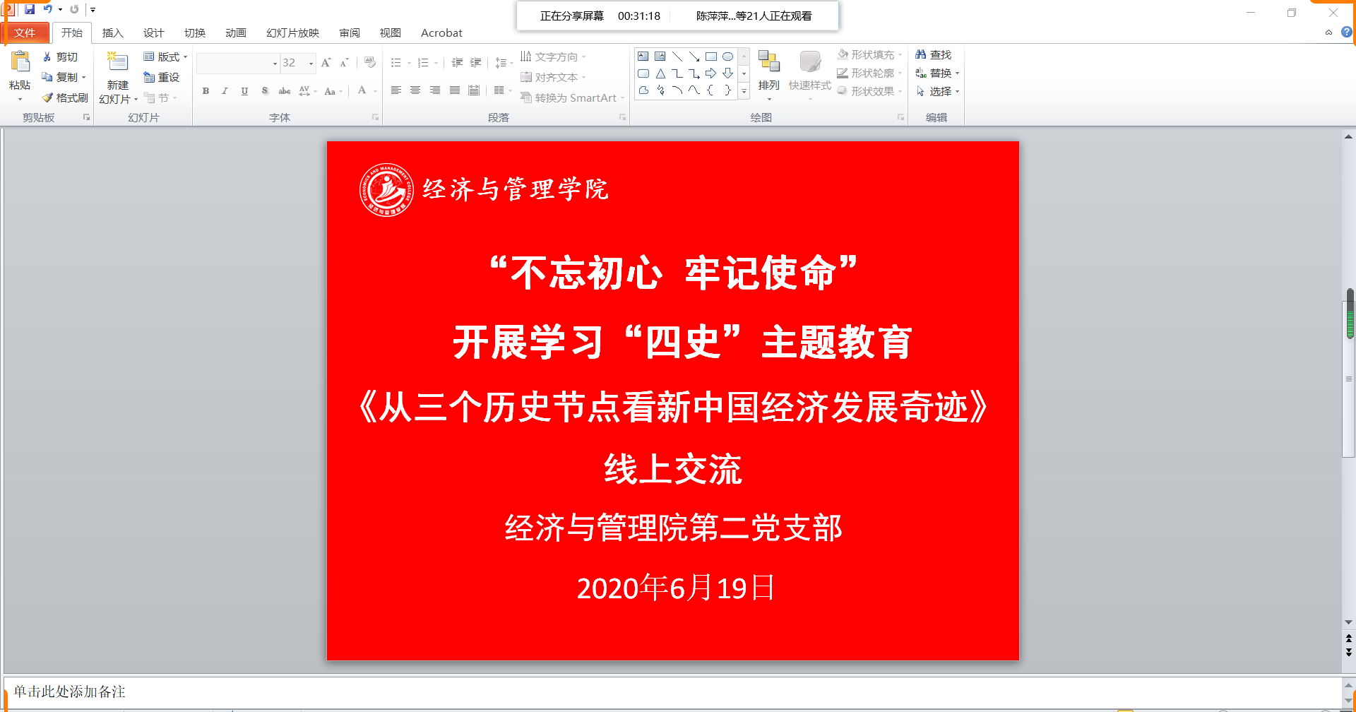 2020年6月19日经济与管理学院第二党支部“不忘初心、牢记使命”学习“四史”主题教育,从三个历史节点看新中国经济发展奇迹,会议由上海师范大学马克思主义学院副院长耿步健教授主讲。