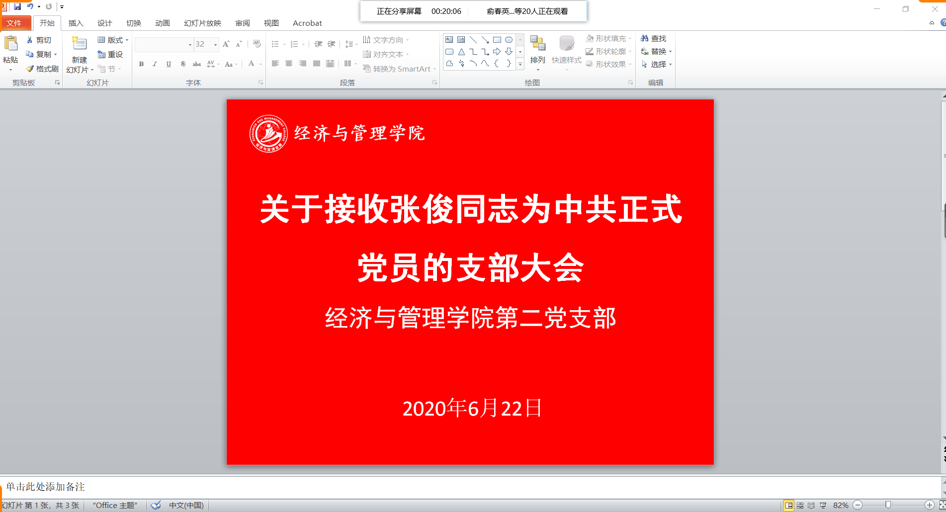 2020年6月22日,经济与管理学院第二党支部召开关于接收张俊同志为中共正式党员的支部大会,会议由经管学院第二支部书记杨慧同志主持。