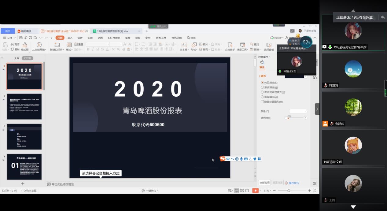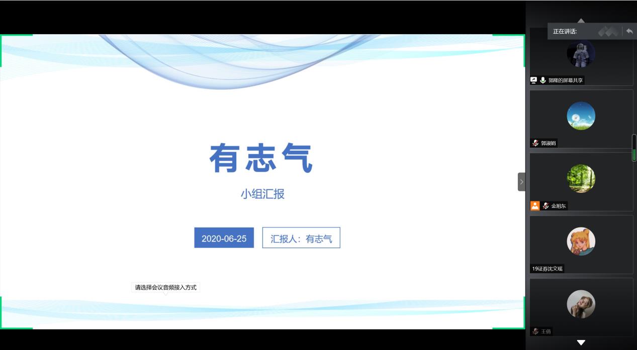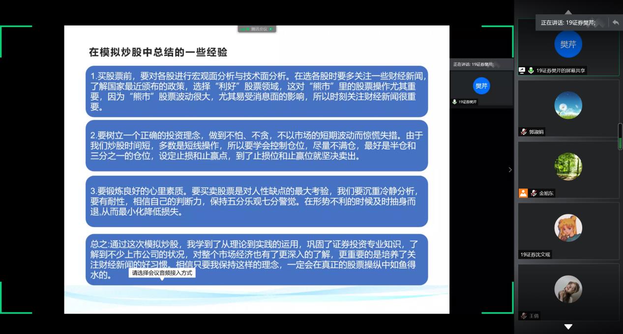 2020年6月28日8:35-11:30,18级、19级证券与期货专业实训投资大赛汇报于腾讯会议举行,本次会议主要是基于18级、19级证券与期货专业期末两周实训进行的证券专业投资大赛和全国证券投资决赛的基础上,对投资大赛的选股的分析和相关内容的汇报。金旭东和郭淑娟两位指导老师,以及18级、19级证券与期货专业全体同学参加此次汇报。