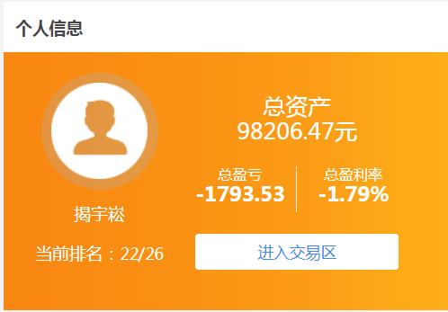 自从学习了证券这门课程,我慢慢学到了许多关于股票的基本概念,我以为自己已经对股票了解得差不多了,以为自己真正炒起股来,也可以得心应手,但是真正进入到模拟炒股阶段,才发觉自己真的一点都不懂,之前自己所想的说出来真的是贻笑大方。不过,通过这次实训模拟比赛,我真的学到了许多。开始以为买很多支就可以稳赚。结果真的让我像瞎猫碰到死老鼠,赚了不少钱。但是之后就惨了,我一味地只买涨停板的股票,结果可就惨了,我亏得差点就想要跳楼了,亏钱的滋味真的不好受,还好只是模拟炒股。后来通过在道富投资官网的学习,我才慢慢得了解到炒股不是一味瞎闷,要善于运用技术分析和基本分析,同时要多关注一些财经新闻报道,终合各方面才能选到好股。