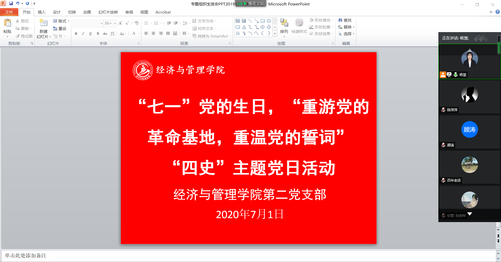 2020年7月1日经济与管理学院第二党支部开展“七一”党的生日、“重温党的革命基地,重温党的誓词”、“四史”主题党日活动,活动由经管学院第二党支部书记杨慧老师主持。