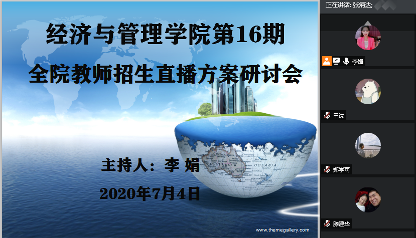 2020年7月4日晚上8点,经管学院利用线上视频召开2019-2020第二学期第十六期教学研讨会,学院全体62名教职工参加在线会议,会议由院长助理李娟老师主持。
