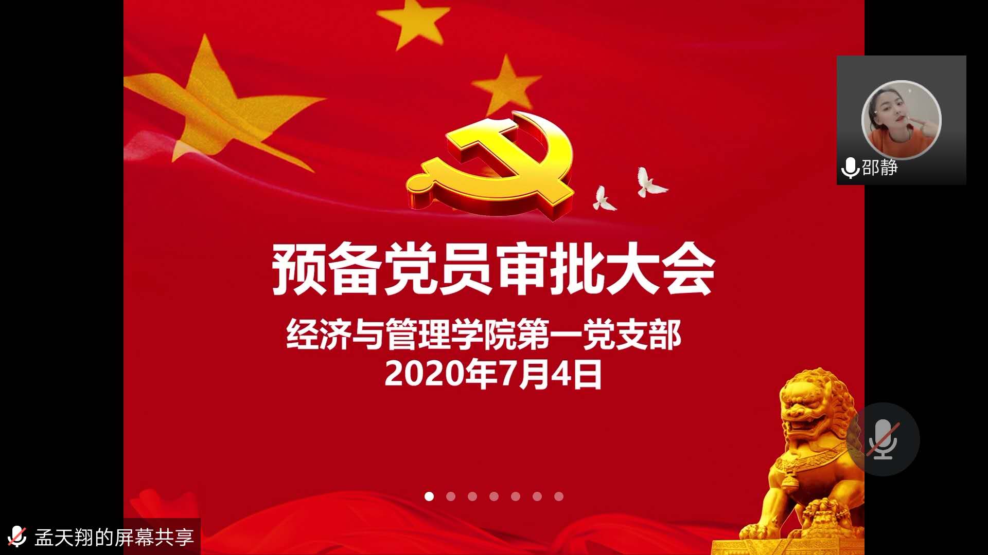2020年7月4日晚9点,经济与管理学院第一党支部在腾讯会议召开了预备党员审批大会,讨论李嘉唯、王敏园、梁利伟和杨宏四名同学的发展事宜。会议由邵静老师主持,我支部共有党员36名,其中有表决权的正式党员15人,出席会议有表决权的党员15人,超过本支部有表决权党员半数,符合规定人数,可以开会。