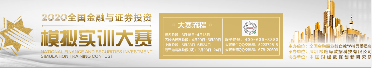 2020全国金融与证券投资模拟实训大赛由全国金融职业教育教学指导委员会主办的全国性大赛。参赛对象为全国本科、高职、中职金融方向专业的在校学生。总参与学校高达全国556所院校、10660支队伍,63960人参赛,采取团体赛制,分区域、分组别进行竞技,可谓竞争非常激烈。