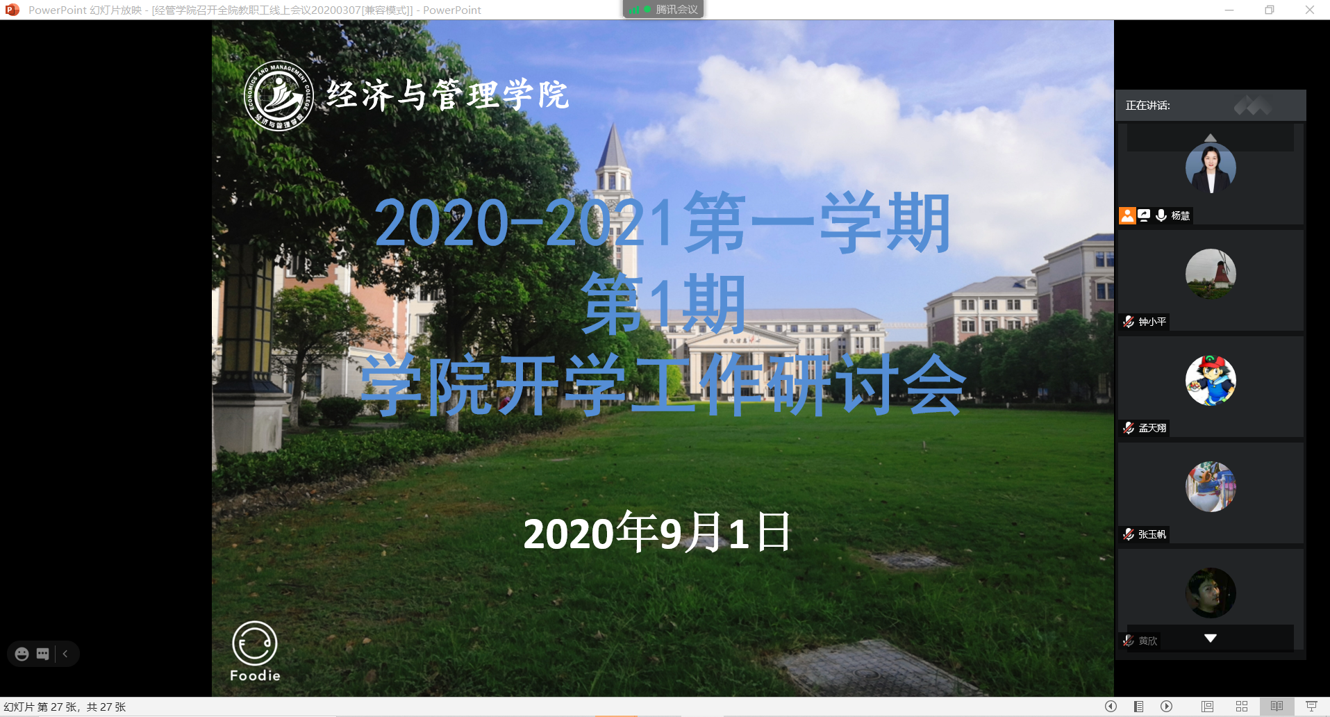 2020年9月1日晚上8点,经管学院利用线上视频召开2020-2021第一学期学院开学工作教师例会,部署教学工作,会议由院长张教授主持。