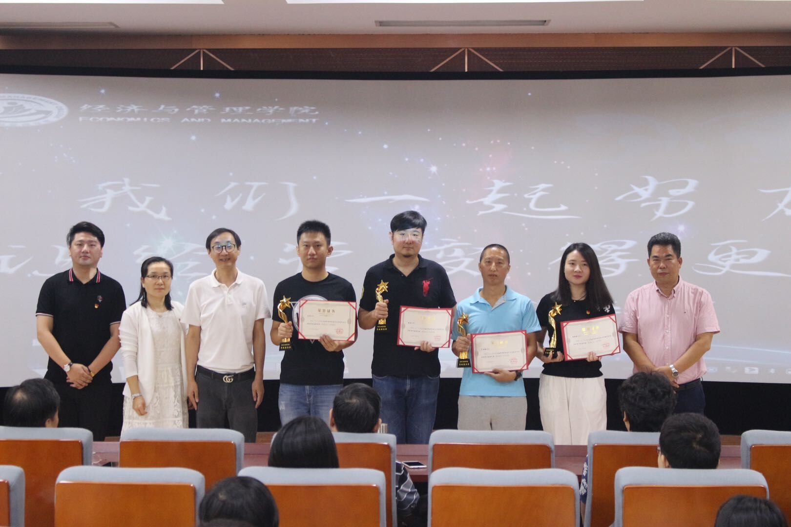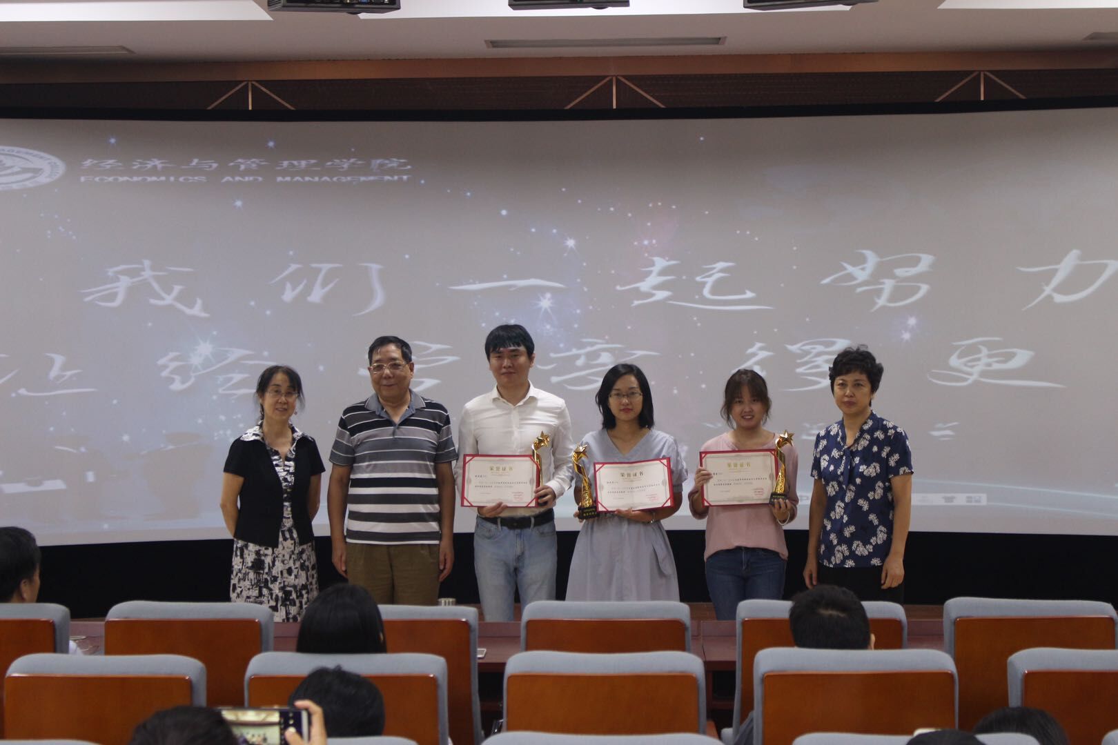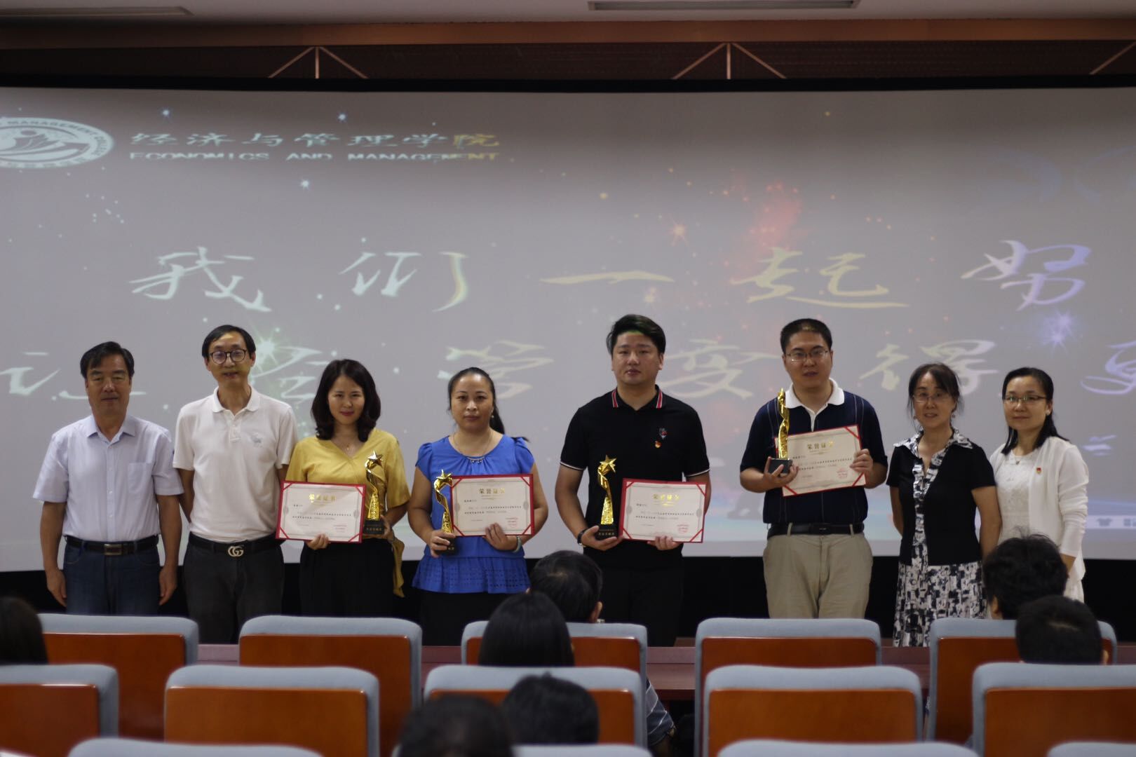 之后,学院举行颁奖仪式,党总支副书记杨慧老师宣读获奖教师名单,学院共有十位教师获得表彰,奖励他们在2019年度为学院建设以及在教学、管理和就业等方面做出的卓越贡献。张院长,王殿安院长,杨慧老师,范海燕院长为李娟、黄侃梅、郭骏和沈敏奇老师颁发杰出贡献奖;范海燕教授,陈思明教授,杨淑媛教授为耿昊裔、陈灵萍和翟翡老师颁发教学创新奖;陈晓斌校长为张俊、王沈、范国强和岳建梅老师颁发卓越服务奖。