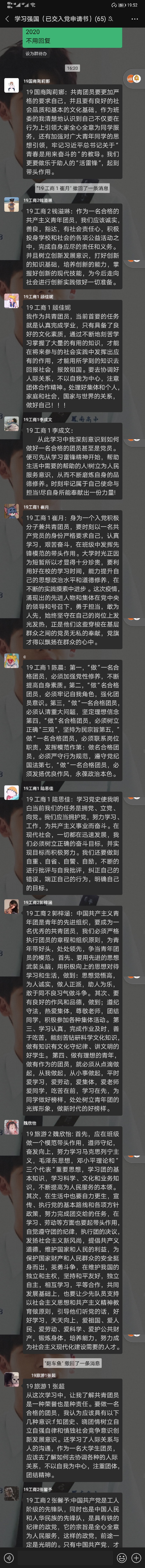 工商国商旅游专业辅导员王锡念与各班团支书一起策划了团员学习活动,共开展5次学习。2020年6月1日下午,第一次学习,由19旅游2班团支书薛佩雨带领工商国商旅游专业的团员一起在腾讯会议学习,本次学习的主题是:“学团史,做合格团员”。