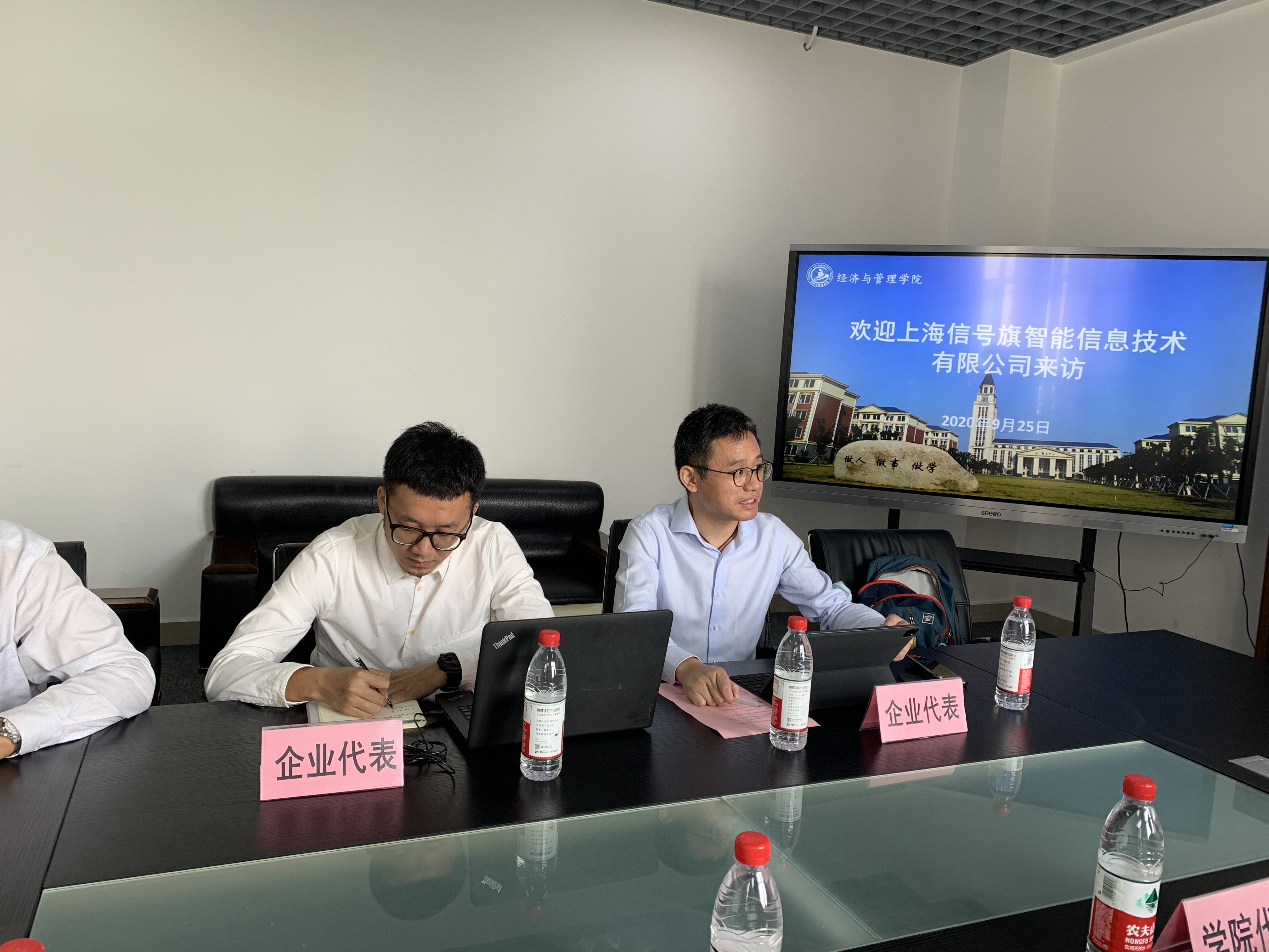 为进一步深化高等职业教育教学改革,全面推进产教深度融合,9月25日上午,经管学院与信号旗智能科技(上海)有限公司(以下简称信号旗智能科技)负责人庄志强、龚杰等在3号楼301会议室举行座谈会。学院教学副院长王殿安教授、党总支副书记杨慧老师、副书记郭骏老师,报关与国际货运顾涛老师,国际商务专业主任俞春英老师,物流管理专业主任于文玲老师出席参与座谈。座谈会由学院党总支副书记郭骏老师主持。