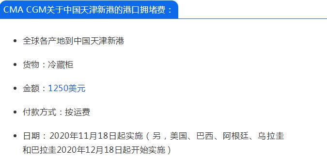 法国达飞CMACGM于2020年11月中旬发布公告,对于本公司经营航线各启运港发往天津新港的冷藏柜收取1250美元的港口拥堵附加费。地中海航运MSC将对从欧洲、加拿大、美国、墨西哥、中美洲和加勒比海地区港口到天津新港的冷藏货物收取拥堵附加费(CGS),标准为每个冷藏货柜1500美元。