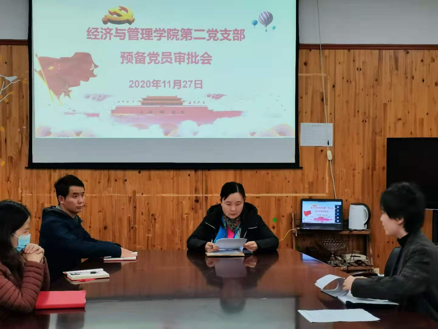 2020年11月27日经济与管理学院第二党支部召开接收张倩倩同志为中共预备党员会议,会议由经济与管理学院党总支副书记杨慧同志主持,杨慧同志先向在座党员教师介绍张倩倩同志的基本情况,张倩倩同志2018年3月参加工作,2018年4月就向党组织递交了《入党申请书》,认真主动参加党组织的培训,并通过党组织的考核。